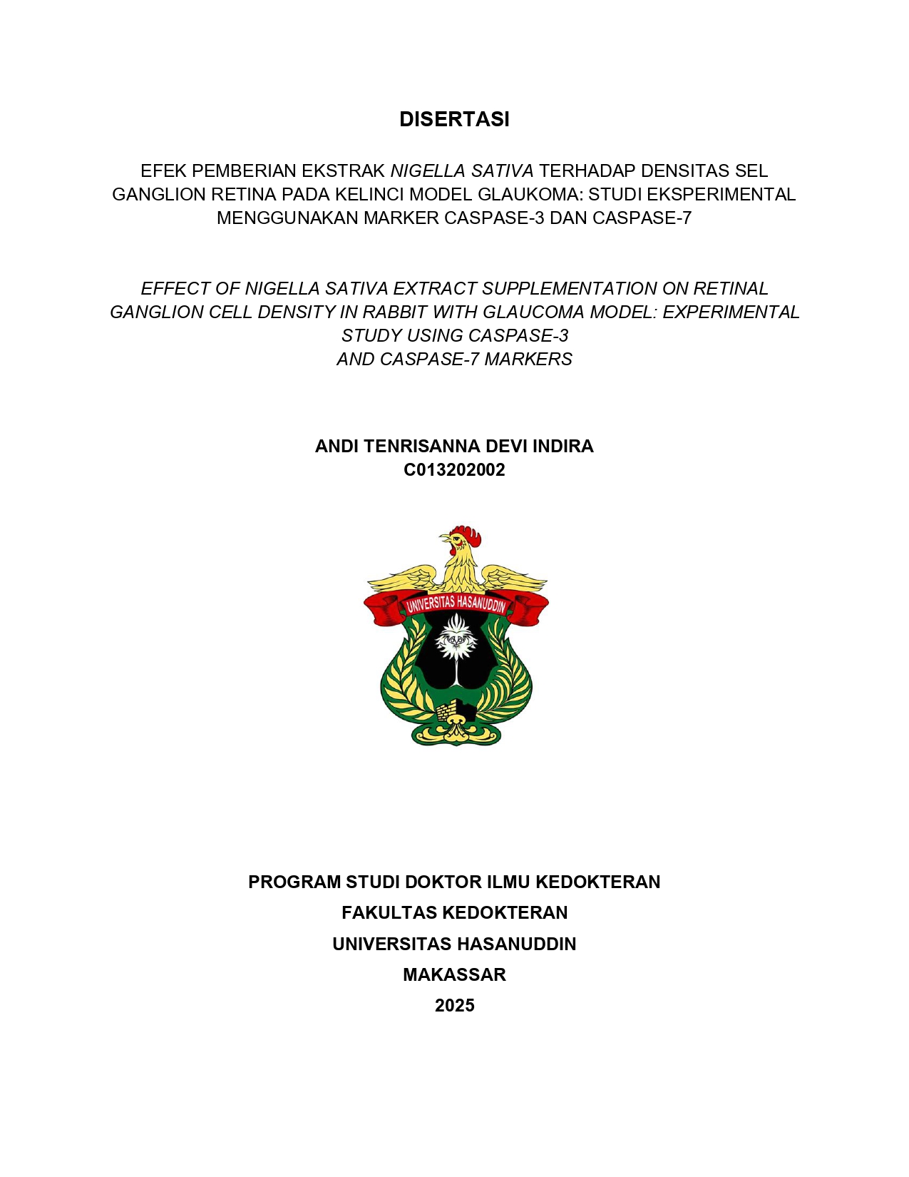 ANDI TENRISANNA DEVI INDIRA. EFEK PEMBERIAN EKSTRAK NIGELLA SATIVA TERHADAP DENSITAS SEL GANGLION RETINA PADA KELINCI MODEL GLAUKOMA: STUDI EKSPERIMENTAL MENGGUNAKAN MARKER CASPASE-3 DAN CASPASE-7 (dibimbing oleh : Andi Muhammad Ichsan, Upik Anderiani Miskad, Habibah Setyawati Muhiddin) Tujuan dari penelitia ini adalah untuk menilai efek pemberian ekstrak Nigella sativa pada kelinci yang diinduksi glaukoma. Terapi neuroproteksi berperan mencegah terjadinya apoptosis pada pasien glaukoma. Nigella sativa diketahui memiliki efek neuroprotektif. Metode: Penelitian ini menggunakan desain penelitian post test menggunakan uji One-Way ANOVA. Kelinci dibagi ke dalam 5 kelompok yaitu kelompok 1 kelinci yang tidak diberi perlakuan apapun, kelompok 2 kelinci yang hanya diinduksi glaukoma tanpa diberi ekstrak Nigella sativa, 3 kelompok lainnya adalah kelinci yang diberi suplementasi ekstrak Nigella sativa dengan 3 dosis berbeda (0,8ml/hari, 1,6ml/hari dan 2,4ml/hari). Pemodelan glaukoma dapat dinyatakan berhasil setelah dilakukan pemeriksaan pasca induksi, dan terdapat peningkatan tekanan intraokular (TIO) dibandingkan TIO sebelum induksi. Pada akhir proses penelitian, hewan percobaan akan diterminasi dan dienukleasi bola matanya. Densitas sel ganglion retina dan ekspresi penanda apoptosis (Caspase-3 dan -7) Hasil: Kelompok kelinci yang disuplementasi dengan 0,8 ml/hari menunjukkan nilai densitas sel ganglion retina yang paling mendekati kelompok kontrol. Pengamatan ekspresi caspase-3 dan -7 menunjukkan bahwa suplementasi 0,8 ml/hari ekstrak Nigella sativa paling berpengaruh dalam menekan ekspresi caspase-3 dan 1,6 ml/hari untuk penanda caspase-7. Kesimpulan: Secara statistik, pemberian ekstrak Nigella sativa menunjukkan potensi untuk menekan terjadinya apoptosis pada hewan model glaukoma. Namun, pemilihan dosis optimal yang dapat direkomendasikan belum dapat disimpulkan dalam penelitian ini. Kata kunci: Nigella sativa, Glaukoma, Sel Ganglion Retina, Caspase-3, Caspase-7