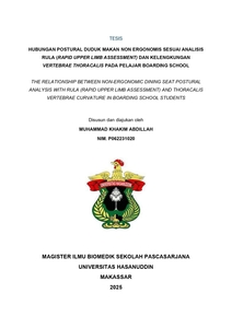 ABSTRAK Abdillah, Muhammad Khakim. Hubungan Postural Duduk Makan Non Ergonomis Sesuai Analisis Rula (Rapid Upper Limb Assessment) Dengan Kelengkungan Vertebrae Thoracalis Pada Pelajar Boarding School”. (dibimbing oleh Siti Rafiah, Nirwana Fitriani Walenna) Latar Belakang : Manusia menghabiskan waktu dalam posisi duduk rata-rata sekitar 6 jam sehari, dan 37% diantaranya duduk lebih dari 8 jam. Remaja menghabiskan waktu duduk lebih banyak dalam sehari ketika aktifitas sekolah. Postur duduk ergonomis sangat penting dilakukan untuk mempertahankan kelengkungan kurva tulang belakang yang stabil. Tujuan : Penelitian ini bertujuan untuk menganalisis hubungan antara postur duduk makan ergonomis dan non-ergonomis, yang dinilai menggunakan Rapid Upper Limb Assessment (RULA), dengan kelengkungan tulang belakang toraks pada pelajar di dua sekolah berasrama di Daerah Istimewa Yogyakarta. Metode : Sebanyak 360 siswa berusia 12-18 tahun berpartisipasi dalam penelitian ini, dipilih menggunakan metode purposive sampling dengan kriteria inklusi dan eksklusi yang telah ditetapkan. Penelitian ini mengukur sudut Cobb pada tiga posisi: berdiri tegak, duduk tegak, dan duduk makan. Analisis RULA dilakukan untuk mengklasifikasikan postur duduk makan sebagai ergonomis atau non-ergonomis. Data dianalisis menggunakan analitik observasional dan uji korelasi chi-square, Spearman, dan Pearson. Hasil : penelitian menunjukkan bahwa postur duduk makan non-ergonomis secara signifikan meningkatkan sudut Cobb dibandingkan dengan postur duduk tegak dan ergonomis. Perbandingan sudut Cobb pada posisi duduk makan dan duduk tegak pada tempat duduk non-ergonomis untuk responden yang tinggal <3 tahun adalah ≈ 3,03, dan untuk responden yang tinggal >3 tahun adalah ≈ 2,63. Pada tempat duduk ergonomis, perbandingannya adalah ≈ 1,998. Terdapat korelasi signifikan antara usia dan Indeks Massa Tubuh (IMT) dengan sudut Cobb hanya pada posisi duduk makan. Kesimpulan : Analisis RULA menunjukkan bahwa tempat duduk non-ergonomis berkontribusi pada peningkatan kelengkungan vertebrae thoracalis. Kejadian kifosis hampir dialami semua responden saat duduk makan, namun sudut Cobb lebih rendah pada responden yang menggunakan tempat duduk ergonomis.