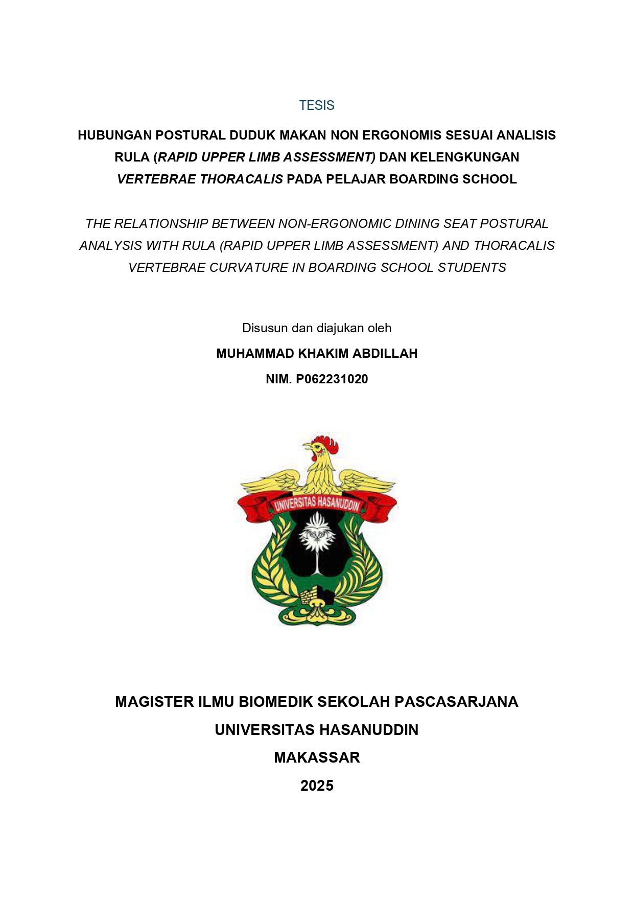 ABDILLAH, MUHAMMAD KHAKIM (2025) HUBUNGAN POSTURAL DUDUK MAKAN NON ERGONOMIS SESUAI ANALISIS RULA (RAPID UPPER LIMB ASSESSMENT) DAN KELENGKUNGAN VERTEBRAE THORACALIS PADA PELAJAR BOARDING SCHOOL = THE RELATIONSHIP BETWEEN NON-ERGONOMIC DINING SEAT POSTURAL ANALYSIS WITH RULA (RAPID UPPER LIMB ASSESSMENT) AND THORACALIS VERTEBRAE CURVATURE IN BOARDING SCHOOL STUDENTS. Thesis thesis, Universitas Hasanuddin.