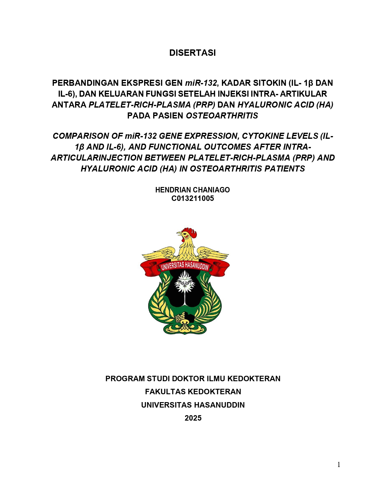 HENDRIAN CHANIAGO. Perbedaan Ekspresi Gen miR-132 dan Kadar Sitokin (IL-1ẞ dan IL-6) pada Osteoarthritis (OA) Lutut Setelah Injeksi Intraartikular antara Platelet-Rich Plasma (PRP) dan Hyaluronic Acid (HA) (dibimbing oleh Muhammad Nasrum Massi, Muhammad Andry Usman, dan Muhammad Phetrus Johan). Penelitian ini bertujuan mengevaluasi perbedaan dampak injeksi intraartikular menggunakan platelet-rich plasma (PRP) dan hyaluronic acid (HA) terhadap perubahan ekspresi gen miR-132 dan kadar sitokin IL-1B, IL-6 pada pasien osteoarthritis (OA) lutut dan mengkaji hubungan perubahan tersebut dengan tingkat keparahan dan fungsi klinis OA lutut berdasarkan VAS dan WOMAC score. Osteoarthritis (OA) lutut adalah penyakit degeneratif, menjadi masalah kesehatan umum yang menyebabkan nyeri dan gangguan fungsi. Beberapa alternatif pengobatan OA lutut yang meliputi injeksi intraartikular PRP dan HA. Namun, mekanisme kerja dan bukti klinis kedua terapi masih perlu didalami lebih lanjut. Sebanyak 44 pasien OA lutut dan 22 relawan sehat terdaftar dalam penelitian ini. Serum plasma pasien dan kontrol dikumpulkan sebelum dan sesudah injeksi, kemudian dilakukan pemeriksaan RT-PCR untuk menentukan tingkat ekspresi miR-132 dan pemeriksaan ELISA untuk menentukan kadar sitokin IL- 13. IL-6. Derajat keparahan OA lutut yang dinilai secara radiologis dan fungsi klinis menggunakan skor nyeri turut diperiksakan. Hasil penelitian menunjukkan bahwa injeksi intraartikular menggunakan PRP dan HA berdampak menurunkan ekspresi miR-132 dan kadar sitokin IL-1B, IL-6. Penurunan lebih besar dihasilkan oleh PRP. Pada evaluasi penentuan kadar nyeri digunakan kriteria VAS, nyeri turun pada setiap grup tindakan, tetapi hanya grup 1 (PRP) memiliki hasil penurunan yang signifikan (p<0.05). Adapun pada evaluasi penentuan kadar nyeri digunakan kriteria WOMAC, nyeri turun pada setiap grup tindakan, tetapi hanya grup 2 (AH) yang low risk memiliki hasil penurunan yang signifikan (p<0.05). Dijumpai juga pada evaluasi hubungan VAS preintervensi dan posintervensi pada setiap kelompok hasil yang bermakna, yakni (p=0.046) dan nilai evaluasi hubungan WOMAC score preintervensi dan posintervensi pada setiap kelompok ditemukan hasil yang bermakna yakni (p=0.022). Terdapat korelasi negatif antara perubahan parameter laboratorium dengan tingkat keparahan dan peningkatan fungsi klinis.