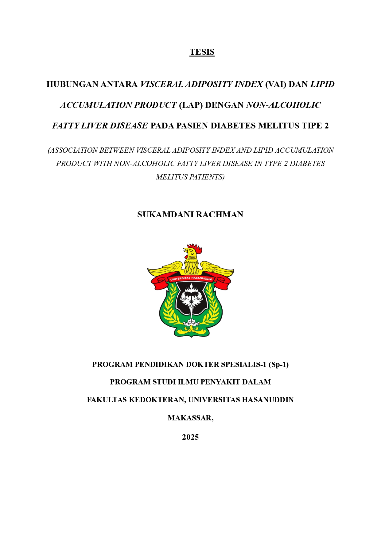RACHMAN, SUKAMDANI (2025) HUBUNGAN ANTARA VISCERAL ADIPOSITY INDEX (VAI) DAN LIPID ACCUMULATION PRODUCT (LAP) DENGAN NON-ALCOHOLIC FATTY LIVER DISEASE PADA PASIEN DIABETES MELITUS TIPE 2 = ASSOCIATION BETWEEN VISCERAL ADIPOSITY INDEX AND LIPID ACCUMULATION PRODUCT WITH NON-ALCOHOLIC FATTY LIVER DISEASE IN TYPE 2 DIABETES MELITUS PATIENTS. Thesis thesis, Universitas Hasanuddin.