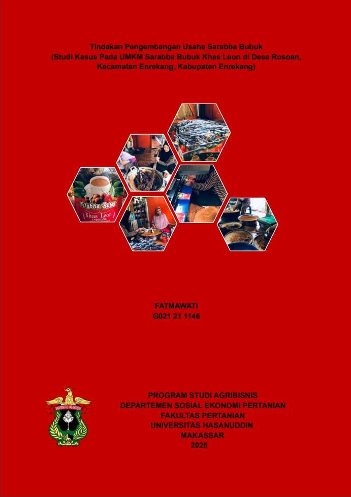 FATMAWATI. Tindakan Pengembangan Usaha Sarabba Bubuk (Studi Kasus Pada UMKM Sarabba Bubuk Khas Leon di Desa Rosoan, Kecamatan Enrekang, Kabupaten Enrekang) (dibimbing oleh: Dr. Ir. Rusli M. Rukka, S.P., M.Si.) Latar belakang. Data statistik tanaman biofarmaka tahun 2023 menunjukkan bahwa komoditas jahe menempati posisi pertama dengan produksi mencapai 219.220,33 ton. Pengolahan jahe masih perlu ditingkatkan untuk menambah nilai, memperpanjang umur simpan, dan memperluas pasar. Salah satu UMKM yang mengolah jahe adalah Sarabba Bubuk Khas Leon di Dusun Leon, Desa Rosoan, Enrekang, Sulawesi Selatan, yang memproduksi minuman tradisional Sarabba dalam bentuk bubuk sejak 2019. Meski dikenal karena rasanya yang khas, data penjualan Sarabba Bubuk menunjukkan fluktuasi dengan penurunan pada 2024 yang membutuhkan strategi pengembangan dan tindakan terencana. Tujuan. Penelitian ini bertujuan untuk mengidentifikasi situasi kasus dan permasalahan yang dihadapi dalam pengembangan Usaha Sarabba Bubuk Khas Leon serta merumuskan alternatif tindakan yang dapat diterapkan untuk mengatasinya. Metode. Seluruh data dan informasi diperoleh menggunakan metode Analisis Perencanaan dan Pengembangan Agrosistem (APPAS). Hasil. Masalah utama pada usaha Sarabba Bubuk Khas Leon yaitu jumlah siklus produksi kurang. Tindakan terpilih untuk mengatasai masalah utama yaitu dengan merekrut tenaga kerja produksi tetap yang sudah ada sebelumnya, menjadwalkan produksi secara rinci yaitu selasa dan jumat, menambah pemasok bahan baku yang semua berasal dari Kabupaten Enrekang, mengefisienkan waktu produksi yaitu 5 jam, merenovasi bangunan dengan menambah luas bangunan, membeli Mesin blender 5 kg stainless steel dan tungku tanah liat ukuran besar, dan memasukkan proposal pengembangan usaha ke Badan Amil Zakat Nasional (BAZNAS). Kesimpulan. Usaha Sarabba Bubuk Khas Leon menghadapi permasalahan yang memengaruhi jumlah produksi dan pendapatan. Penyelesaian masalah ini membutuhkan identifikasi penyebab, perencanaan strategi, serta pelaksanaan tindakan yang terarah untuk memastikan keberlanjutan dan perkembangan usaha.