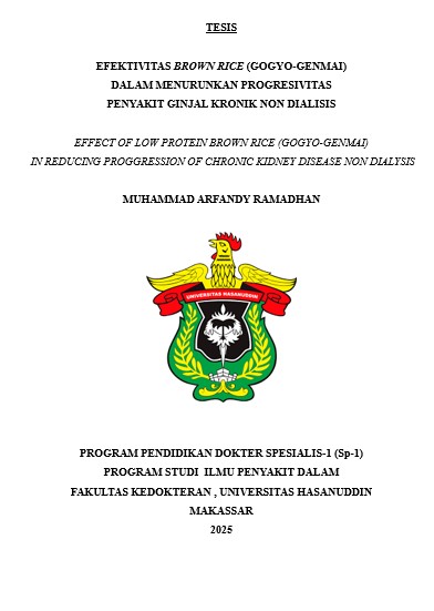 RAMADHAN, MUHAMMAD ARFANDY (2025) EFEKTIVITAS BROWN RICE (GOGYO-GENMAI) DALAM MENURUNKAN PROGRESIVITAS PENYAKIT GINJAL KRONIK NON DIALISIS = EFFECT OF LOW PROTEIN BROWN RICE (GOGYO-GENMAI) IN REDUCING PROGGRESSION OF CHRONIC KIDNEY DISEASE NON DIALYSIS. Disertasi thesis, Universitas Hasanuddin.