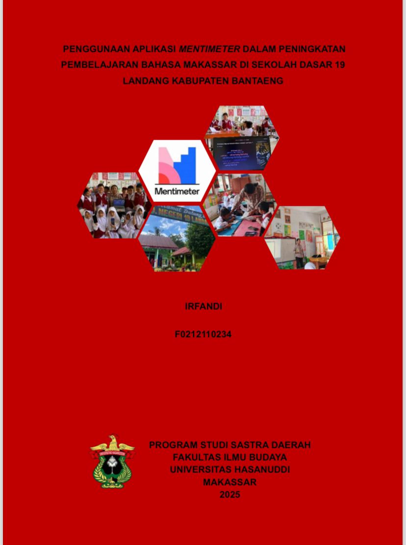 ABSTRAK Irfandi ,2025,” Penggunaan Aplikasi Mentimeter Dalam Peningkatan Pembelajaran Bahasa Makassar Di Sekolah Dasar 19 Landang Kabupaten Bantaeng”. (dibimbing oleh Sumarlin Rengko HR) Penelitian ini bertujuan untuk mendeskripsikan dan menganalisis efektivitas penggunaan Aplikasi Mentimeter dalam meningkatkan pembelajaran Bahasa Makassar di kelas IV Sekolah Dasar 19 Landang Kabupaten Bantaeng. Latar belakang penelitian ini berangkat dari permasalahan rendahnya minat dan hasil belajar siswa terhadap mata pelajaran Bahasa Makassar, yang disebabkan oleh penggunaan metode pembelajaran yang monoton, kurang interaktif, serta minimnya pemanfaatan teknologi dalam proses pembelajaran. Aplikasi Mentimeter sebagai media digital interaktif dipilih untuk menjawab tantangan tersebut dengan harapan dapat menciptakan suasana belajar yang lebih menyenangkan, partisipatif, dan bermakna. Hasil penelitian menunjukkan bahwa penerapan Aplikasi Mentimeter dalam pembelajaran Bahasa Makassar memberikan dampak yang signifikan terhadap peningkatan keterlibatan siswa di kelas. Siswa menunjukkan antusiasme yang tinggi, aktif dalam menjawab pertanyaan, dan lebih fokus mengikuti materi yang disampaikan. Selain itu, hasil evaluasi belajar juga menunjukkan peningkatan dibandingkan sebelum penggunaan Aplikasi Mentimeter. Tercatat adanya peningkatan hasil belajar sebesar 58,90% dari nilai rata-rata pre-test sebesar 54,5 menjadi 86,6 pada post-test 2 setelah intervensi dilakukan. Guru pun merasakan kemudahan dalam mengelola kelas serta lebih mudah mengevaluasi pemahaman siswa secara real-time. Berdasarkan temuan tersebut, disarankan agar pihak sekolah dapat mendukung penggunaan teknologi dalam pembelajaran dengan menyediakan infrastruktur yang memadai serta pelatihan bagi guru dalam mengintegrasikan media digital ke dalam pembelajaran. Penelitian ini diharapkan dapat menjadi rujukan bagi pendidik dan praktisi pendidikan dalam upaya meningkatkan mutu pembelajaran Bahasa Makassar melalui pemanfaatan teknologi berbasis aplikasi interaktif. Kata Kunci: Mentimeter, Siswa, Bahasa Makassar, Bantaeng.