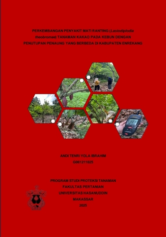 ABSTRAK ANDI TENRI YOLA IBRAHIM. Perkembangan penyakit mati ranting (Lasiodiplodia theobromae) tanaman kakao pada kebun dengan penutupan penaung yang berbeda di Kabupaten Enrekang (dibimbing oleh Ade Rosmana). Latar belakang. Penyakit mati ranting merupakan salah satu penyakit penting pada tanaman kakao (Theobromae cacao L.) yang menyerang pucuk dan ranting. Gejala yang ditimbulkan oleh penyakit mati ranting yaitu menguningnya daun kedua atau ketiga dari ujung ranting, yang diikuti dengan bercak hijau pada permukaan daun. Kemudian gejala berkembang sehingga seluruh permukaan daun berwarna kuning kecokelatan dan akhirnya gugur menyisakan ranting tanpa daun. Tujuan. Penelitian ini bertujuan untuk mengetahui perkembangan penyakit yang disebabkan oleh patogen Lasiodiplodia theobromae pada lahan kakao yang memiliki penanung berbeda. Metode. Penelitian ini dilaksanakan dikebun kakao yang berada di Dusun Leoran, Kecamatan Enrekang, Sulawesi Selatan, berlangsung dari bulan September – November 2024. Rancangan yang digunakan adalah Rancangan Acak Kelompok (RAK) dengan lima ulangan berupa blok dengan tiga perlakuan naungan yaitu naungan tertutup, terbuka, dan sedang. Parameter penelitian yang digunakan meliputi naungan, insidensi penyakit, intensitas cahaya. Hasil. Penelitian ini menunjukkan bahwa naungan berpengaruh terhadap perkembangan penyakit. Serangan penyakit ini lebih banyak ditemukan pada naungan terbuka karena infeksi cendawan L. theobromae awalnya terdapat daun-daun yang kering berwarna cokelat dan melekat pada ranting. Naungan terbuka (D1) memiliki intensitas cahaya tertinggi, yaitu 5179 lux dengan insidensi penyakit L. theobromae tertinggi 43,6%, naungan tertutup (D2) memiliki intensitas cahaya terendah yaitu 668 lux dengan insidensi penyakit L. theobromae terendah 17,4%, dan naungan sedang (D3) memiliki intensitas cahaya 1246 lux dengan insidensi penyakit L. theobromae 37,4%. Kesimpulan. Dengan demikian bahwa, ditemukan berkembangnya penyakit pada lahan terbuka dapat dijadikan landasan untuk pengendalian penyakit ini misalnya dengan sistem agroforestri.