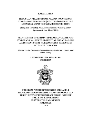 Penelitian ini bertujuan untuk menilai ”Hubungan Nilai Estimasi Plasma Volume dan Syndecan-1, terhadap Sequential Organ Failure Assesment Score (Sofa) Pasien Sepsis di ICU”. Dimana Kerusakan endotel yang ditandai dengan peningkatan Syndecan-1 dan potensi gangguan volume plasma pada pasien sepsis, dianggap berkontribusi pada perkembangan sepsis seperti yang tercermin dalam skor SOFA. Metode: Penelitian ini menggunakan desain observasional analitik dengan pendekatan Cross Sectional.. Populasi penelitian adalah pasien sepsis yang dirawat di ICU Rumah Sakit Wahidin Sudirohusodo. Estimasi Plasma Volume (ePVS), Syndekan-1, dan skor SOFA pada 24 jam pertama dan 72 jam diukur dan dinilai setelah di diagnosis sepsis. Nilai ePVS dihitung menggunakan rumus dari Duarte et al, yaitu ePVS (mL / g) = 100 × (1-hematokrit) / hemoglobin (g / dL). Syndecan- 1 diambil dari sampel serum dan diukur menggunakan immunoassay sindekan-1 larut manusia dengan kit ELISA. Penelitian ini dilakukan mulai 1 Januri sampai April 2025. Hasil: Jumlajh sampel pada studi ini, adalah 30 pasien sepsis dengan rentang usia 19-64 tahun dan sekitar 53,3% adalah laki-laki. Sebagian besar pasien memiliki BMI normal dan dengan berbagai indikasi untuk perawatan ICU termasuk perawatan pasca operasi laparotomi, perawatan pasca operasi bedah saraf, perawatan pasca operasi Tulang belakang, dan perawatan pasca operasi bedah lainnya, serta perawatan dengan infeksi saluran pernapasan (Tabel 1). Tingkat Syndecan-1, nilai volume plasma yang diperkirakan (ePVS) dan skor SOFA mengalami penurunan signifikan dari nilai pada 24 jam pertama dibandingkan 72 jam setelah diagnosis dengan nilai p <0,05 (Tabel 2). Kadar Syndecan-1 berhubungan secara signifikan dengan skor SOFA dalam 24 jam pertama dengan koefisien korelasi yang kuat sebesar 0,869 dengan nilai p <0,05, sedangkan nilai estimasi plasma volume dengan skor SOFA dalam 24 jam pertama tidak berhubungan dengan nilai p >0,05 (Tabel 3). Kadar Syndecan-1 berhubungan secara signifikan dengan skor SOFA dalam 72 jam pertama dengan koefisien korelasi yang kuat sebesar 0,646 dengan nilai p <0,05, sedangkan nilai estimasi plasam volume dengan skor SOFA dalam 72 jam pertama tidak berhubungan dengan nilai p >0,05 (Tabel 4). Kesimpulan : Penurunan kadar Syndecan-1 memiliki hubungan yang kuat dengan penurunan skor SOFA pada pasien sepsis di ICU
