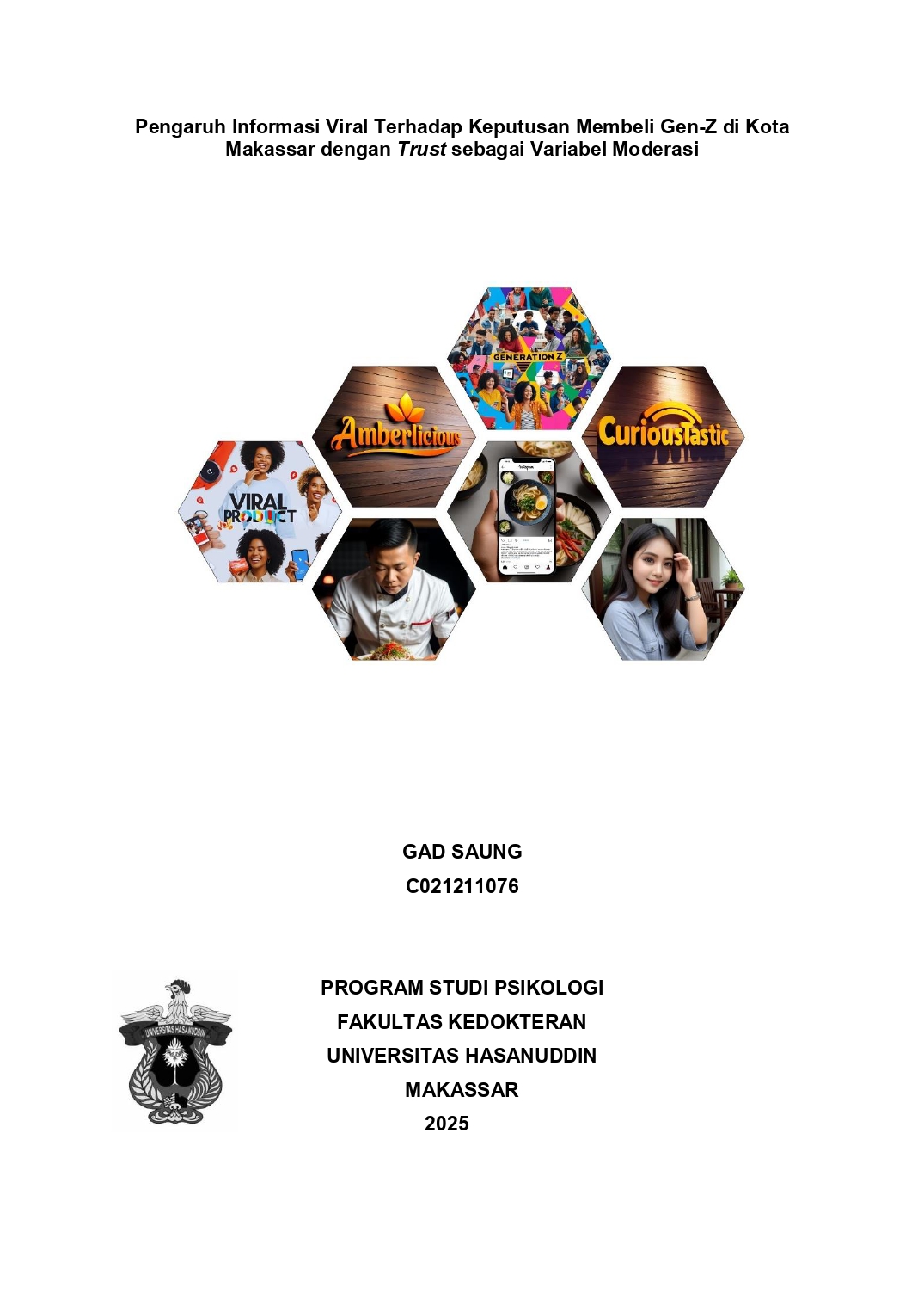 SAUNG, GAD (2025) Pengaruh Informasi Viral Terhadap Keputusan Membeli Gen-Z di Kota Makassar dengan Trust sebagai Variabel Moderasi = The Influence of Viral Information on Gen-Z Purchasing Decisions in Makassar City with Source Credibility as a Moderating Variable. Skripsi thesis, Universitas Hasanuddin.
