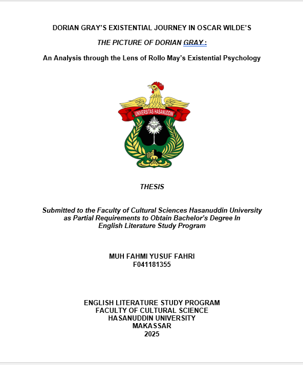 Muh Fahmi Yusuf Fahri. 2025. Perjalanan Eksistensial Karakter Dorian Gray dalam Novel Oscar Wilde, The Picture of Dorian Gray: Analisis melalui Lensa Psikologi Eksistensial Rollo May (Dibimbing oleh Abbas dan Rezky Ramadhani) Tujuan dari penelitian ini adalah untuk menganalisis perjalanan eksistensial Dorian Gray dalam novel Oscar Wilde, The Picture of Dorian Gray, melalui lensa psikologi eksistensial Rollo May. Studi ini membahas konflik moral dan psikologis internal yang dialami oleh Dorian Gray, yang dipicu oleh kondisi masyarakat yang dimana terdapat sebuah lingkungan yang lebih menghargai penampilan daripada sebuah kenyataan, serta menciptakan ketegangan yang mendorong Dorian ke dalam sebuah krisis eksistensial dan kehancuran diri. Tujuan penelitian ini adalah untuk mengidentifikasi dan menganalisis bagaimana konsep-konsep kunci psikologi eksistensial Rollo May (seperti Dasein, kecemasan, kebebasan, tanggung jawab, rasa bersalah, kepedulian, makna, dan takdir) tercermin dalam perjalanan Dorian Gray, serta menjelaskan bagaimana refleksi konsep-konsep eksistensial ini, yang dipengaruhi oleh Lord Henry Wotton dan Basil Hallward, membentuk nasib eksistensialnya. Penelitian ini menggunakan metode kualitatif deskriptif dengan pendekatan strukturalisme untuk menganalisis unsur-unsur intrinsik novel, seperti penokohan, alur, latar, dan tema. Data dikumpulkan melalui studi pustaka, melibatkan pembacaan cermat teks novel, identifikasi kutipan-kutipan relevan, dan mengaitkan struktur naratif dengan perkembangan psikologis karakter Dorian Gray dalam novel. Analisis data dilakukan dengan menerapkan teori psikologi eksistensial Rollo May untuk menginterpretasikan konflik dan disintegrasi moral Dorian. Hasil penelitian menunjukkan bahwa Dorian Gray awalnya otentik namun secara bertahap menolak kebebasan dan tanggung jawab, memicu kecemasan eksistensial dan akumulasi rasa bersalah yang dialihkan ke potret. Kapasitasnya untuk cinta dan kepedulian terkikis, digantikan oleh kehendak yang rusak menuju kesenangan, yang akhirnya membawa pada kehampaan dan ketiadaan makna. Nasib tragisnya, diwujudkan dalam potret, yaitu konsekuensi dari penolakannya yang konsisten terhadap otentisitas dan kebenaran batin. Studi ini menegaskan relevansi psikologi eksistensial Rollo May dalam memahami kompleksitas karakter dalam sebuah karya sastra, menyoroti bahwa penolakan terhadap otentisitas dan kebebasan eksistensial dapat berujung pada kehampaan dan kehancuran diri.