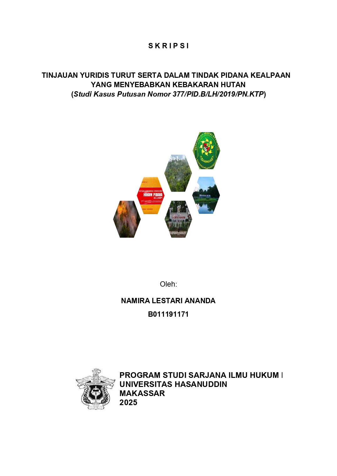ananda, namira lestari (2025) Tinjauan Yuridis Turut Serta Dalam Tindak Pidana Kealpaan Yang Menyebabkan Kebakaran Hutan (Studi Kasus Putusan Nomor 377/Pid.B/Lh/2019/PN Ktp) = Juridical Review of Participation in the Crime of Negligence Causing Forest Fires (Case Study of Decision Number 377/Pid.B/Lh/2019/PN Ktp). Skripsi thesis, UNIVERSITAS HASANUDDIN MAKASSAR.