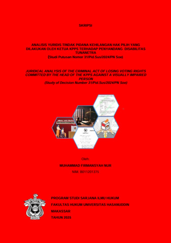 NUR, MUHAMMAD FIRMANSYAH (2025) Analisis Yuridis Tindak Pidana Kehilangan Hak Pilih Yang Dilakukan Oleh Ketua Kpps Terhadap Penyandang Disabilitas Tunanetra (Studi Putusan Nomor 31/Pid.Sus/2024/Pn Soe) = Juridical Analysis Of The Criminal Act Of Losing Voting Rights Committed by The Head Of The KPPS Againts A visually Impaired Person (Case Study of Decision Number 31/Pid.Sus/2024/PN Soe). Skripsi thesis, UNIVERSITAS HASANUDDIN MAKASSAR.