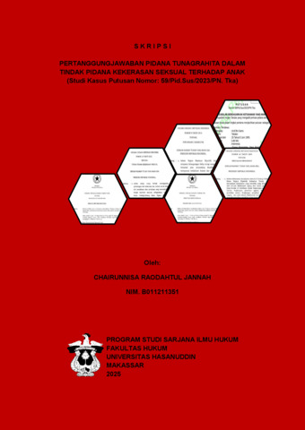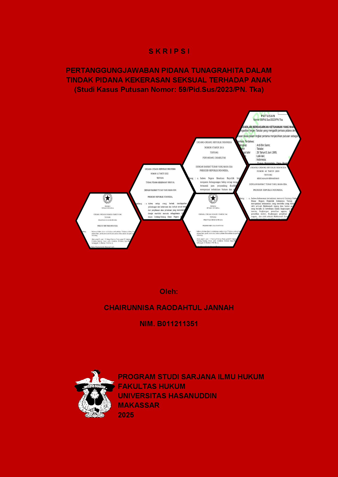 CHAIRUNNISA RAODAHTUL JANNAH (B011211351). Pertanggungjawaban Pidana Tunagrahita Dalam Tindak Pidana Kekerasan Seksual Terhadap Anak (Studi Kasus Putusan Nomor: 59/Pid.Sus/2023/PN. Tka). Dibimbing oleh Audyna Mayasari Muin sebagai Pembimbing Utama. Latar Belakang: Pelaku kejahatan terhadap anak dapat berasal dari berbagai latar belakang, termasuk individu dengan gangguan kejiwaan, seperti disabilitas intelektual atau tunagrahita. Keberadaan pelaku tunagrahita dalam kasus kekerasan seksual terhadap anak menghadirkan tantangan tersendiri dalam penegakan hukum, terutama dalam menentukan pertanggungjawaban pidana mereka. Tujuan: Penelitian ini bertujuan untuk menganalisis pertanggungjawaban pidana tunagrahita dalam tindak pidana kekerasan seksual dalam putusan nomor: 59/Pid.Sus/2023/PN.Tka dan pertimbangan hukum hakim dalam menjatuhkan pidana terhadap tunagrahita pada putusan nomor: 59/Pid.Sus/2023/PN.Tka. Metode: Penelitian dilakukan dengan penelitian yuridis normatif atau penelitian hukum kepustakaan. Penelitian ini akan berfokus pada analisis terhadap peraturan perundang-undangan, putusan pengadilan, doktrin hukum, dan berbagai sumber hukum lainnya yang relevan dengan topik penelitian. Hasil: Hasil penelitian menunjukkan (1) Pertanggungjawaban pidana Tunagrahita kurang mampu bertanggungjawab karena memiliki disabilitas intelektual. Maka Terdakwa harus diberikan perawatan, rehabilitasi, terapi lebih lanjut. (2) Pertimbangan Hakim dalam menjatuhkan pidana di bawah minimum kurang tepat menurut pandangan penulis. Hakim yang memberikan hukuman lebih ringan dapat menciptakan persepsi bahwa tindakan kekerasan seksual terhadap anak tidak mendapatkan penanganan serius oleh sistem hukum, sehingga berpotensi merugikan kepentingan korban dan masyarakat secara keseluruhan.
