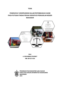 ABSTRAK A. MUHAMMAD RAHMAT (B012211050). Penerapan Yurisprudensi dalam Pertimbangan Hakim pada Putusan Tindak Pidana Korupsi di Pengadilan Negeri Makassar (dibimbing oleh Hijrah Adhyanti Mirzana dan Audyna Mayasari Muin). Latar Belakang: Pentingnya penerapan yurisprudensi dalam menyelesaikan perkara tindak pidana korupsi sebagai rujukan hukum yang sah. Yurisprudensi berperan penting sebagai pendukung penyempurnaan dan pengembangan sistem hukum. Tujuan: Penelitian ini bertujuan untuk menganalisis indikator yurisprudensi sebagai pedoman hakim dalam memutus perkara tindak pidana korupsi dan tujuan pemidanaan dalam penerapan yurisprudensi di Pengadilan Negeri Makassar. Metode: Tipe penelitian ini adalah penelitian hukum empiris, pendekatan konseptual, pendekatan perundang-undangan, serta bahan hukum Primer dan Sekunder, data dianalisis secara kualitatif deskriptif. Hasil: Penelitian menunjukkan bahwa 1) Hakim sepatutnya memperhatikan Indikator Yurisprudensi dalam memutus perkara tindak pidana korupsi, seperti yang termuat dalam kaidah hukum yurisprudensi No. Induk:1/Yur/Kor/2018 terkait pengadaan barang/jasa. Berdasarkan hasil penelitian ini terkai putusan Tahun 2021 - 2023, ditemukan satu perkara yang di dalam fakta persidangannya terdapat 6 indikator yurisprudensi tersebut dan bersesuaian dengan kaidah hukum yurisprudensi, namun secara formil hakim tidak mengutip suatu Yurisprudensi dalam Putusannya. 2) Tujuan penerapan yurisprudensi untuk memastikan kaidah hukum yang lahir dari Putusan Hakim yang telah ditetapkan Mahkamah Agung sebagai Yurisprudensi tetap seyogyanya diikuti oleh Hakim setelahnya pada perkara yang serupa, agar tercipta kepastian hukum dan tidak terjadi disparitas putusan. Kesimpulan: Penerapan indikator Yurisprudensi telah dilakukan oleh hakim namun tidak secara tegas diakui karena tidak dicantumkan dalam putusannya. Adapun tujuan penerapan Yurisprudensi demi mewujudkan kepastian hukum dan menghindari adanya disparitas putusan. Kata Kunci: Pertimbangan Hakim; Tindak Pidana Korupsi, Yuriprudensi