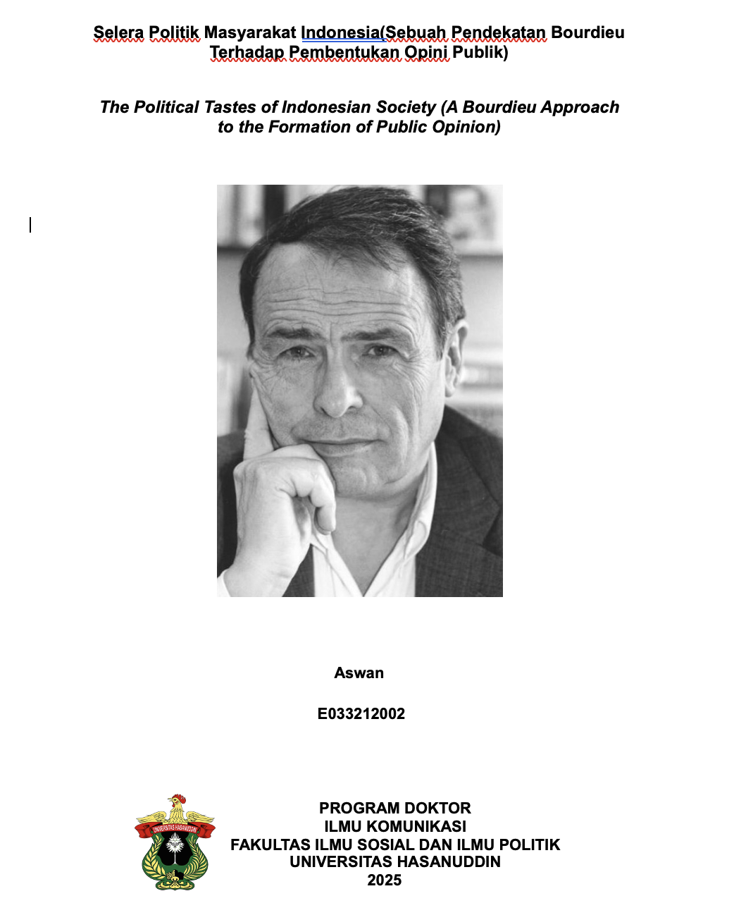 ASWAN, ASWAN (2025) Selera Politik Masyarakat Indonesia (Sebuah Pendekatan Bourdieu Terhadap Pembentukan Opini Publik) = The Political Tastes of Indonesian Society (A Bourdieu Approach to the Formation of Public Opinion). Disertasi thesis, Universitas Hasanuddin.