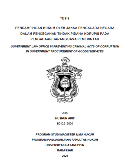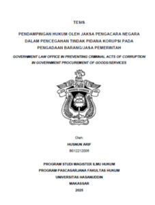 ARIF, HUSNUN (2025) PENDAMPINGAN HUKUM OLEH JAKSA PENGACARA NEGARA DALAM PENCEGAHAN TINDAK PIDANA KORUPSI PADA PENGADAAN BARANG/JASA PEMERINTAH = GOVERNMENT LAW OFFICE IN PREVENTING CRIMINAL ACTS OF CORRUPTION IN GOVERNMENT PROCUREMENT OF GOODS/SERVICES. Thesis thesis, UNIVERSITAS HASANUDDIN MAKASSAR.