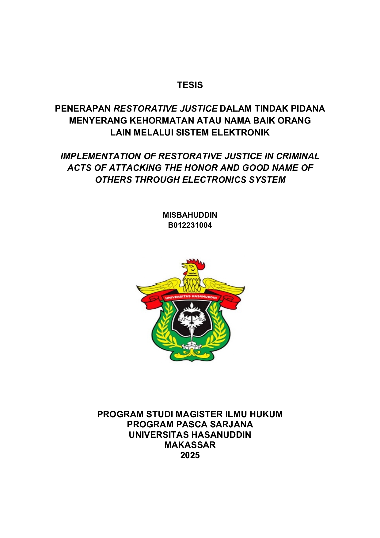 MISBAHUDDIN, MISBAHUDDIN (2025) PENERAPAN RESTORATIVE JUSTICE DALAM TINDAK PIDANA MENYERANG KEHORMATAN ATAU NAMA BAIK ORANG LAIN MELALUI SISTEM ELEKTRONIK = IMPLEMENTATION OF RESTORATIVE JUSTICE IN CRIMINAL ACTS OF ATTACKING THE HONOR AND GOOD NAME OF OTHERS THROUGH ELECTRONICS SYSTEM. Thesis thesis, UNIVERSITAS HASANUDDIN MAKASSAR.