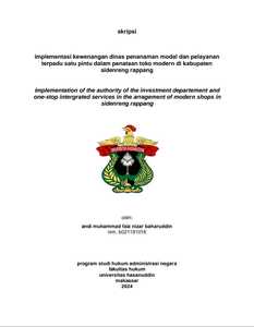 Baharuddin, Andi Muhammad Faiz Nizar (2025) IMPLEMENTASI KEWENANGAN DINAS PENANAMAN MODAL DAN PELAYANAN TERPADU SATU PINTU DALAM PENATAAN TOKO MODERN DI KABUPATEN SIDENRENG RAPPANG = IMPLEMENTATION OF THE AUTHORITY OF THE INVESTMENT DEPARTEMENT AND ONE-STOP INTERGRATED SERVICES IN THE ARRAGEMENT OF MODERN SHOPS IN SIDENRENG RAPPANG. Skripsi thesis, UNIVERSITAS HASANUDDIN MAKASSAR.