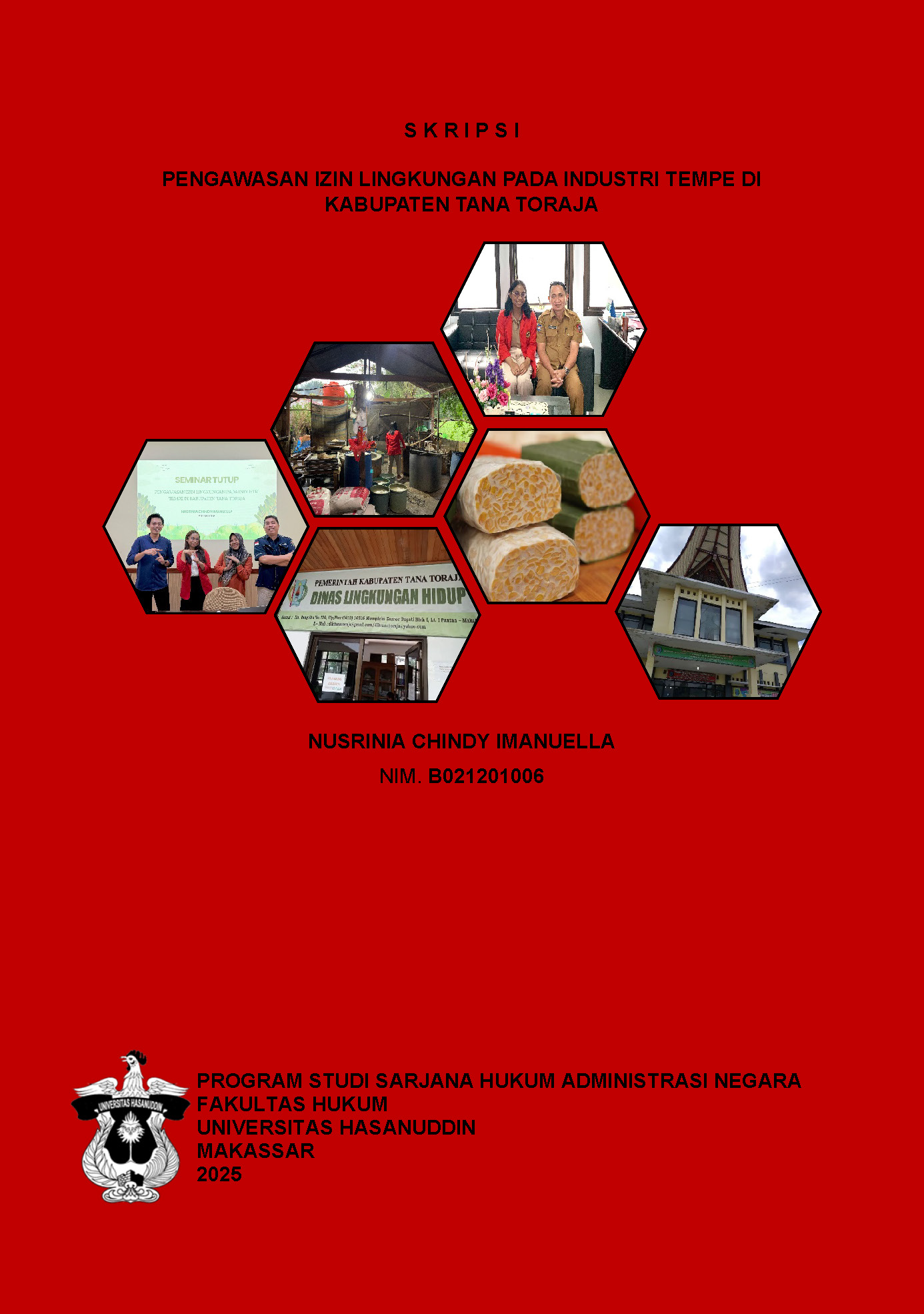 NUSRINIA CHINDY IMANUELLA (B021201006). PENGAWASAN IZIN LINGKUNGAN PADA INDUSTRI TEMPE DI KABUPATEN TANA TORAJA. Dibimbing oleh Ahsan Yunus sebagai Pembimbing. Latar Belakang: Penelitian ini dilatar belakangi oleh pertumbuhan industri tempe di Kabupaten Tana Toraja yang sering tidak disertai kepatuhan terhadap perizinan lingkungan, menyebabkan pencemaran dan penurunan Pendapatan Asli Daerah (PAD). Padahal, perlindungan lingkungan hidup merupakan hak konstitusional yang dijamin Pasal 28H ayat (1) UUD 1945. Tujuan: Penelitian ini bertujuan untuk mengetahui efektivitas pengawasan izin lingkungan oleh pemerintah daerah dan akibat hukum terhadap industri tempe yang tidak memiliki izin lingkungan di Kabupaten Tana Toraja. Metode: Tipe penelitian yang digunakan adalah penelitian hukum empiris. Penelitian ini dilakukan pada Dinas Penanaman Modal Dan Pelayanan Terpadu Satu Pintu Kabupaten Tana Toraja, Dinas Lingkungan Hidup Kabupaten Tana Toraja, industri tempe yang memiliki izin dan tidak memiliki izin di. Data primer dapat diperoleh dengan cara melakukan observasi dan wawancara langsung dengan narasumber. Data sekunder diperoleh melalui studi kepustakaan, buku-buku teks hukum, skripsi, tesis, disertasi hukum, jurnal hukum, dan studi internet. Hasil: Penelitian menunjukkan bahwa (1) Pengawasan izin lingkungan oleh pemerintah daerah terhadap industri tempe di Kabupaten Tana Toraja tidak efektif. Meskipun secara normatif dalam berbagai peraturan perundang-undangan telah mengatur tentang peran pemerintah dalam pengawasan, namun pada tataran praktis hal itu tidak dilaksanakan secara konsekuen. Hal ini berdampak pada pencemaran lingkungan yang serta menurunnya Pendapatan Asli Daerah (PAD) akibat berkurangnya pemasukan dari pajak. ;(2) ) Akibat dari penegakan hukum yang tidak efektif oleh pemerintah daerah terhadap industri tempe yang tidak memiliki izin sangat mempengaruhi pada lingkungan yang ada disekitarnya terutama menyebabkan kerusakan lingkungan dan terganggunya masyarakat yang ada di sekitar industri. Ketidakmampuan pemerintah daerah dalam mengawasi dan menindak tegas pelanggaran tersebut mengakibatkan pencemaran lingkungan yang menggangu kenyamanan warga di sekitar industri. Kesimpulan: Pengawasan izin lingkungan di Kabupaten Tana Toraja tidak efektif, sehingga diperlukan penegakan hukum yang lebih tegas dan sosialisasi yang intensif kepada pelaku usaha. Langkah ini penting untuk melindungi lingkungan, meningkatkan PAD, dan menjamin kenyamanan masyarakat.