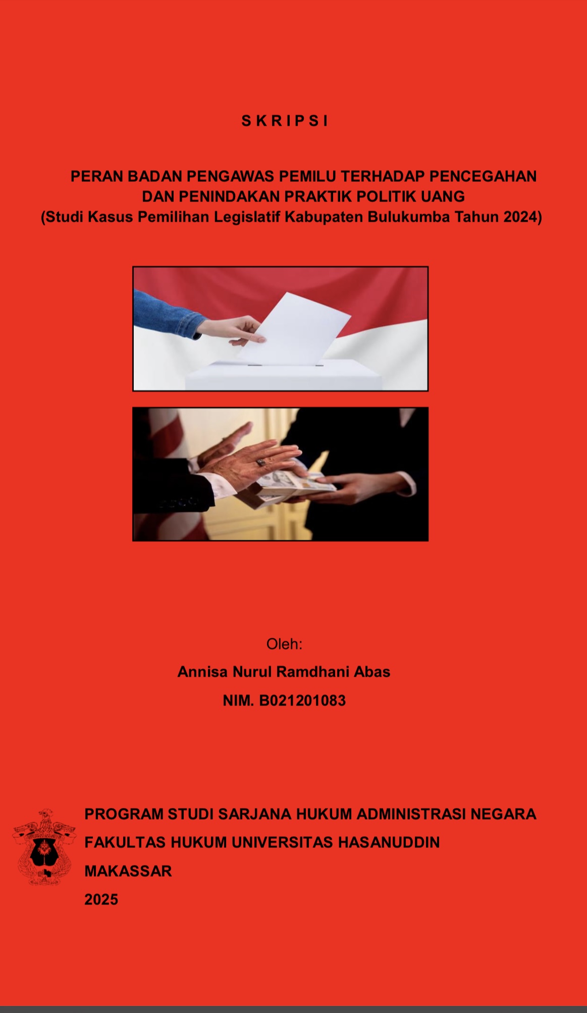 RAMADHANI, ANNISA NURUL (2025) PERAN BADAN PENGAWAS PEMILU TERHADAP PENINDAKAN DAN PENCEGAHAN PRAKTIK POLITIK UANG (STUDI KASUS PEMILIHAN LEGISLATIF KABUPATEN BULUKUMBA) = THE ROLE OF THE ELECTION SUPERVISORY BODY IN THE PREVENTION AND ACTION OF MONEY POLITICAL PRACTICES (Case Study of the 2024 Bulukumba Regency Legislative Election. Skripsi thesis, UNIVERSITAS HASANUDDIN MAKASSAR.