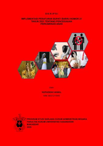 NURAZIZAH AKMAL (B021211049). Implementasi Peraturan Bupati Barru Nomor 21 Tahun 2021 tentang Pencegahan Perkawinan Anak, dibimbingan oleh Ibu Ariani Arifin sebagai pembimbing. Latar belakang: Perkawinan anak di Indonesia khususnya di Kabupaten Barru merupakan masalah serius yang berdampak negatif dan melanggar hak-hak anak. Meskipun Peraturan Bupati Barru Nomor 21 Tahun 2021 tentang Pencegahan Perkawinan Anak telah diundangkan, praktik ini masih terjadi secara signifikan di masyarakat, menunjukkan perlunya evaluasi mendalam terhadap implementasinya.Tujuan: Penelitian ini bertujuan untuk mengetahui dan menganalisis implementasi Peraturan Bupati Barru Nomor 21 Tahun 2021 Tentang Pencegahan Perkawinan Anak dan faktor-faktor yang memengaruhi proses penerapannya. Metode: Penelitian ini menggunakan metode penelitian hukum empiris dengan pendekatan deskriptif, Lokasi penelitian dilakukan di Kabupaten Barru khususnya di DPMDPPKBP3A dan Desa Kading, dengan sumber data primer dan sumber data sekunder. Analisis data dilakukan secara kualitatif. Hasil: Penelitian ini menunjukkan bahwa (1) Implementasi peraturan tersebut belum optimal. Beberapa kendala yang ditemukan antara lain petunjuk teknis acuan pelaksanaan implementasi peraturan tersebut belum dilegalisasi, terbatasnya koordinasi lintas sektor dan ada indikasi perkawinan tidak tercatat secara resmi sehingga angka perkawinan anak masih tinggi; (2) Penerapan peraturan ini dipengaruhi oleh substansi hukum yang belum memuat mekanisme teknis secara rinci, kuatnya tradisi dan budaya lokal yang masih mendukung praktik perkawinan anak, pergaulan bebas dan tekanan ekonomi yang mendorong keluarga menikahkan anak. Kesimpulan: peraturan ini belum efektif dalam mencapai tujuan utamanya, yaitu mencegah dan menekan angka perkawinan anak di Kabupaten Barru. Diperlukan penyempurnaan regulasi, penguatan koordinasi lintas sektor, serta pendekatan sosial dan ekonomi yang adaptif terhadap kondisi lokal.