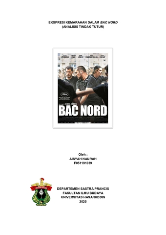 Penelitian ini berjudul “Ekspresi Kemarahan dalam BAC Nord (Analisis Tindak tutur)”. Penelitian ini menggunakan metode deskriptif kualitatif dengan data berupa dialog yang mengandung kemarahan atau emosi marah di dalamnya. Teori yang digunakan dalam penelitian ini adalah, teori tindak tutur ekspresif oleh Searle, teori tindak tutur langsung dan tidak langsung oleh Wijana, dan teori nonverbal oleh DeVito. Tujuan penelitian ini adalah, untuk mengidentifikasi dialog kemarahan dalam film BAC Nord dan unsur-unsur nonverbal yang menyertai saat terjadinya dialog tersebut. Hasil penelitian ini mengidentifikasi sebanyak 33 data yang mengandung tindak tutur ekspresif marah lalu diklasifikasi menjadi tindak tutur langsung yang muncul sebanyak 28 kali dan tindak tutur tidak langsung yang muncul sebanyak 5 kali. Selain itu, unsur-unsur nonverbal yang muncul dalam penelitian ini adalah, body messages, facial expression, paralanguage, dan eye communication.