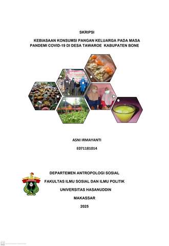 ABSTRAK Penelitian ini bertujuan untuk mendeskripsikan kondisi masyarakat dan kebiasaan konsumsi pangan keluarga dimasa pandemi Covid-19 khususnya pada warga masyarakat Desa Tawaroe di Kabupaten Bone. Dengan fokus pada kebiasaan konsumsi pangan keluarga dalam rumah tangga di masa pandemi. Meliputi bagaimana pemenuhan kebutuhan pangan, akses pangan dimasa pandemi dan pola konsumsi pangan, serta adaptasi kebiasaan adat masyarakat Desa Tawaroe di masa pandemi.Metode yang di gunakan dalam penelitian ini adalah kualitatif dengan pendekatan etnografi. penentuan informan dalam penelitin ini adalah purposive sampling (disengaja). Dengan teknik pengumpulan data observasi, wawancara dan studi literatur. Hasil penelitian ini menujukkan bahwa terjadi perubahan dalam berbagai sektor termasuk kebiasaan konsumsi pangan keluarga. Pada masyarakat Desa Tawaroe di Kabupaten Bone dalam memenuhi kebutuhan pangannya dimasa pandemi sangat bergantung pada sumber daya alam yang ada dilingkungannya. Dan masyarakat yang menggunakan kearifan lokalnya dalam merespon fenomena pandemi covid-19 melalui pengetahuan lokal masyarakat tentang makanan yang dijadikan obat dan obat dijadikan makanan seperti halnya membuat ramuan herbal alami dari tumbuhan yang tumbuh dilingkungannya. Serta bagaimana masyarakat beradaptasi dengan kebiasaanya adatnya dimasa pandemi Covid-19. Kata Kunci : Kebiasaan, Konsumsi, Pangan, Adaptasi, Covid-19