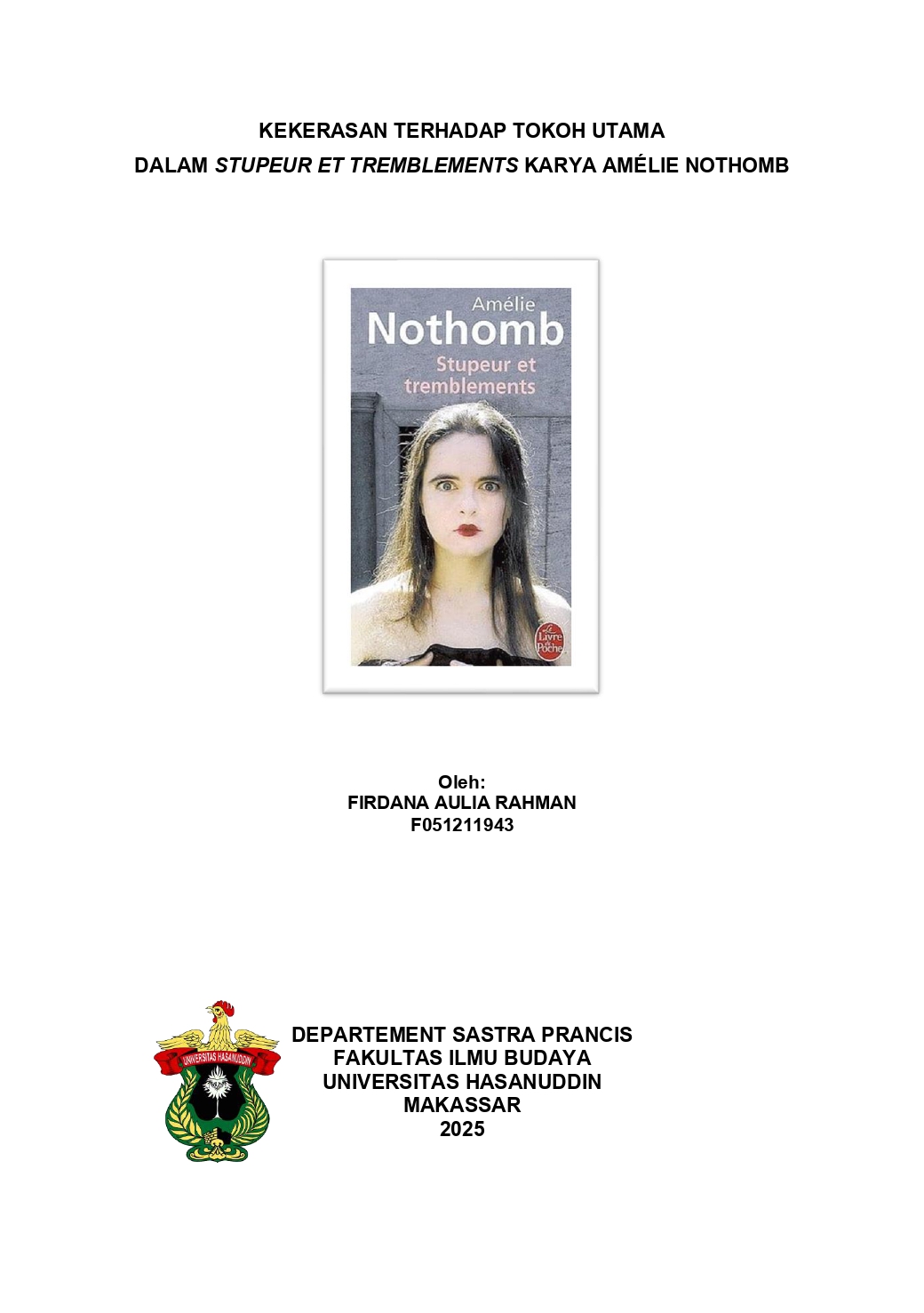 FIRDANA AULIA RAHMAN (F051211043) “Kekerasan terhadap Tokoh Utama dalam Stupeur et Tremblements Karya Amélie Nothomb”, dibimbing oleh Dr. Andi Faisal, S.S.,M.Hum. Penelitian ini bertujuan untuk menganalisis bentuk-bentuk kekerasan dan penyebabnya yang dialami oleh tokoh utama, Amélie, dalam novel Stupeur et Tremblements karya Amélie Nothomb. Metode yang digunakan dalam penelitian ini adalah deskriptif kualitatif dengan pendekatan sosiologi sastra. Teori tokoh penokohan digunakan untuk menjelaskan penggambaran tokoh, dan hubungan antara tokoh utama dan tokoh-tokoh lainnya yang terlibat. Teori kekerasan Johan Galtung digunakan untuk menganalisis bentuk-bentuk kekerasan langsung, struktural, dan kultural yang dialami Amélie, sementara teori kekuasaan Pierre Bourdieu digunakan untuk memahami faktor-faktor penyebab munculnya kekerasan tersebut melalui konsep modal, habitus, dan arena. Hasil penelitian menunjukkan bahwa Amélie mengalami kekerasan langsung berupa fisik, intimidasi verbal dan perlakuan merendahkan dari atasannya, kekerasan struktural melalui sistem hierarki perusahaan yang menindas, serta kekerasan kultural yang melegitimasi ketidakadilan berdasarkan norma budaya Jepang. Peneliti menyimpulkan bahwa dalam Stupeur et Tremblements, kekerasan yang dialami Amélie merupakan hasil dari ketidakseimbangan relasi kuasa dalam lingkungan kerja yang hierarkis dan opresif. Kekerasan tersebut tidak hanya berdampak pada fisik dan psikologis Amélie, tetapi juga mencerminkan ketidakadilan yang tertanam dalam struktur sosial dan budaya perusahaan.