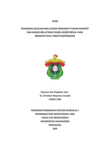 JUNAEDI, CHRISTIAN HARYANTO (2025) ENGARUH ADJUVAN MELATONIN TERHADAP FUNGSI KOGNITIF DAN KADAR MELATONIN PASIEN SKIZOFRENIA YANG MENDAPATKAN TERAPI RISPERIDONE = The Effect Of Melatonin Adjuvant On Cognitive Function And Melatonin Levels In Schizophrenia Patients Receiving Risperidone Therapy. Thesis thesis, Universitas Hasanuddin.