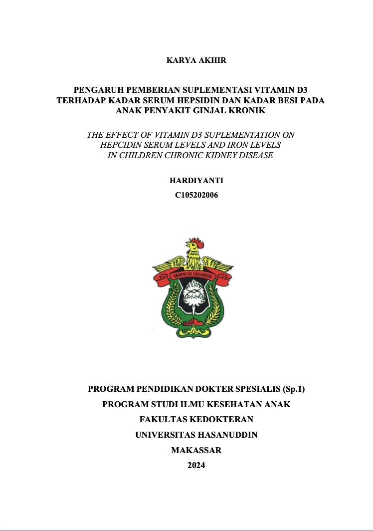 HARDIYANTI, HARDIYANTI (2024) Pengaruh Pemberian Suplementasi Vitamin D3 Terhadap Kadar Serum Hepsidin dan Kadar Besi pada Anak Penyakit Ginjal Kronik = The Effect of Vitamin D3 Supplementation on Hepcidin Serum Levels and Iron Levels in Children Chronic Kidney Disease. Thesis thesis, Universitas Hasanuddin.
