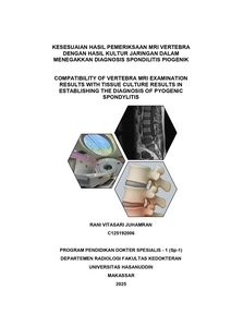 JUHAMRAN, RANI VITASARI (2025) KESESUAIAN HASIL PEMERIKSAAN MRI VERTEBRA DENGAN HASIL KULTUR JARINGAN DALAM MENEGAKKAN DIAGNOSIS SPONDILITIS PIOGENIK = COMPATIBILITY OF VERTEBRA MRI EXAMINATION RESULTS WITH TISSUE CULTURE RESULTS IN ESTABLISHING THE DIAGNOSIS OF PYOGENIC SPONDYLITIS. Thesis thesis, Universitas Hasanuddin.