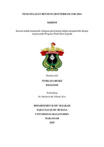 Nurkaya Reski, F061211045 “Pemanfaatan Benteng Rotterdam 1940-2014” dibimbing oleh Dr. Muslimin AR. Effendy, M.A Penelitian ini dilatarbelakangi oleh pentingnya memahami dinamika pemanfaatan Benteng Rotterdam sebagai situs cagar budaya di Makassar, yang sejak penetapannya sebagai monumen pada 1940 hingga 2014 tetap dimanfaatkan untuk berbagai kepentingan non-pelestarian seperti hunian, perkantoran, dan aktivitas lainnya. Metode yang digunakan dalam penelitian ini adalah metode sejarah yang terdiri dari beberapa tahapan pemilihan topik, pengumpulan sumber, kritik sumber, interpretasi dan penulisan sejarah. Hasil dari penelitian ini menunjukkan bahwa baru pada 1970-an mulai dilakukan upaya serius pelestarian, seperti pengosongan kawasan, pemugaran, dan perencanaan pemanfaatan budaya. Hal ini terjadi karena lemahnya regulasi pelestarian, minimnya kesadaran masyarakat, dan situasi politik pasca kemerdekaan. Benteng ini kemudian ditetapkan sebagai Situs Cagar Budaya Nasional pada 2014. Proses pelestarian tersebut menegaskan pentingnya sinergi antara kebijakan hukum, dukungan sosial, dan peran aktif pemerintah maupun masyarakat.