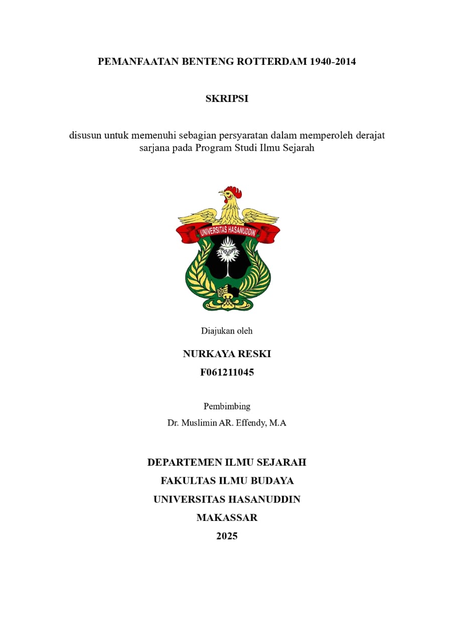 RESKI, NURKAYA (2025) Pemanfaatan Benteng Rotterdam 1940-2014 = Utilization of Fort Rotterdam 1940-2014. Skripsi thesis, Universitas Hasanuddin.