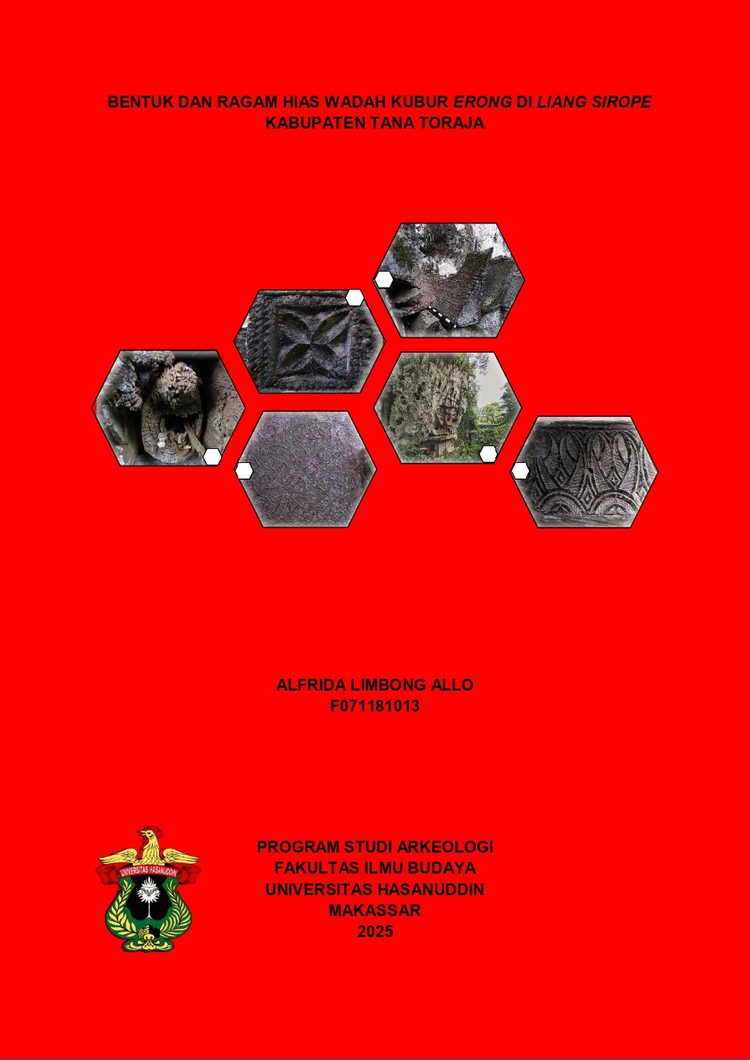 Alfrida Limbong Allo. Bentuk Dan Ragam Hias Wadah Kubur Erong Di Liang Sirope Kabupaten Tana Toraja (dibimbing oleh Akin Duli dan Muhammad Nur) Melalui observasi, diketahui bahwa Liang Sirope dalam fungsinya sebagai kompleks penguburan keluarga memiliki beberapa temuan yang berkaitan dengan aktivitas penguburan, salah satunya wadah kubur erong. Pada zaman dahulu, erong merupakan wadah kubur yang digunakan oleh kelas bangsawan tinggi (tana’ bulaan) dan bangsawan menengah (tana’ bassi) sehingga penulis memandang penting untuk dikaji. Belum adanya penelitian spesifik terhadap erong pada situs ini, sehingga dilakukan penelitian awal untuk mengidentifikasi bentuk dan ragam hias erong serta perkembangan erong. Metodologi penelitian meliputi pengumpulan data melalui studi pustaka, survei lapangan dan wawancara dilanjutkan dengan analisis tipologi dan stilistik serta pendekatan perbandingan. Hasil analisis tipologi terhadap 21 erong menunjukkan bahwa bentuk erong di Liang Sirope berdasarkan bentuknya terdiri dari bentuk perahu dan bentuk babi. Hasil analisis stilistik menghasilkan dua jenis erong berdasarkan penggunaan ragam hias yakni tipe 1 (polos) dan tipe 2 (berhias). Tipe 2 (berhias) memiliki 23 motif hias yang dikategorikan dalam empat jenis ragam hias yakni geometris, flora, fauna dan alam. Adanya perbedaan bentuk dan ragam hias dipengaruhi oleh sistem kepercayaan Aluk To Dolo dan stratifikasi sosial dalam masyarakat Toraja. Hasil perbandingan antara karakteristik erong di Liang Sirope dengan karakteristik erong di Kawasan Etnik Toraja yang telah diketahui masa perkembangannya menunjukkan bahwa secara relatif, masa awal perkembangan erong di Liang Sirope dimulai sekitar 1200 Masehi hingga 1960-an.