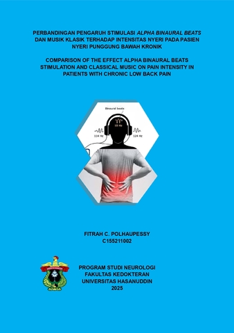 POLHAUPESSY, FITRAH C. (2025) PERBANDINGAN PENGARUH STIMULASI ALPHA BINAURAL BEATS DAN MUSIK KLASIK TERHADAP INTENSITAS NYERI PADA PASIEN NYERI PUNGGUNG BAWAH KRONIK = COMPARISON OF THE EFFECT ALPHA BINAURAL BEATS STIMULATION AND CLASSICAL MUSIC ON PAIN INTENSITY IN PATIENTS WITH CHRONIC LOW BACK PAIN. Thesis thesis, Universitas Hasanuddin.