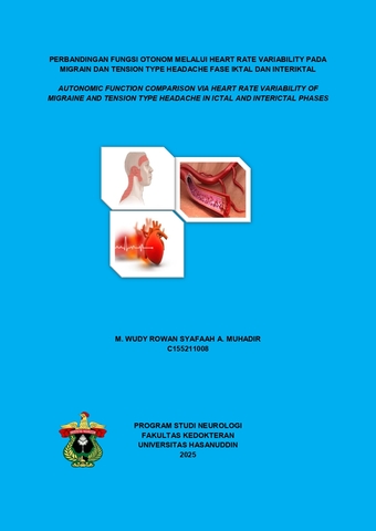 Migrain dan tension-type headache (TTH) adalah gangguan nyeri kepala primer yang paling umum yang mempengaruhi jutaan orang di seluruh dunia. Kedua kondisi ini melibatkan mekanisme patofisiologi yang kompleks dengan bukti yang berkembang menunjukkan bahwa disfungsi sistem saraf otonom memainkan peran penting. Heart Rate Variability (HRV) menyediakan metode non- invasif untuk menilai fungsi otonom, yang berpotensi mengungkap pola yang berbeda antara jenis nyeri kepala ini selama fase yang berbeda. Metode: Dalam penelitian observasional cross-sectional ini, 50 subjek (25 dengan migrain, 25 dengan TTH) berusia 18-59 tahun direkrut dari poliklinik neurologi RSUP Dr. Wahidin Sudirohusodo Makassar dan rumah sakit jejaring pendidikan dari Maret hingga April 2025. HRV diukur menggunakan sensor Polar H10 chest strap yang terhubung dengan aplikasi smartphone Elite HRV selama 5 menit pada fase iktal dan interiktal. Parameter HRV termasuk RMSSD, PNS Index, SNS Index, dan Mean RR interval dianalisis menggunakan software Kubios HRV Scientific dan dibandingkan antar kelompok menggunakan uji statistik yang sesuai. Hasil: Selama fase iktal, pasien migrain menunjukkan PNS Index yang secara signifikan lebih tinggi dibandingkan pasien TTH (0,25 ± 3,21 vs -1,14 ± 0,99, p=0,011), menunjukkan dominasi parasimpatis relatif selama serangan migrain. Pada fase interiktal, Mean RR interval secara signifikan lebih pendek pada pasien migrain dibandingkan pasien TTH (611,76 ± 207,14 ms vs 758,00 ± 115,65 ms, p=0,004), menunjukkan disfungsi otonom yang persisten. SNS Index secara konsisten lebih tinggi pada pasien TTH di kedua fase, meskipun tidak mencapai signifikansi statistik selama perbandingan fase individual. Kesimpulan: Migrain dan TTH menunjukkan profil otonom yang berbeda melalui analisis HRV. Migrain menunjukkan perubahan otonom yang dinamis dengan kompensasi parasimpatis selama serangan dan takikardia persisten selama periode interiktal, sedangkan TTH menunjukkan dominasi simpatis yang konsisten. Temuan ini mendukung mekanisme patofisiologi yang berbeda dan menunjukkan potensi untuk pendekatan terapeutik yang menargetkan otonom yang spesifik untuk setiap jenis nyeri kepala.