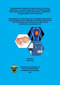 Diabetes Melitus Tipe 2 (DMT2) seringkali menyebabkan komplikasi neurologis, terutama Distal Symmetrical Polyneuropathy (DSPN) dan Diabetic Autonomic Neuropathy (DAN). DAN dapat bermanifestasi sebagai Cardiovascular Autonom Neuropathy (CAN) maupun disfungsi sudomotor, yang keduanya berkontribusi terhadap meningkatnya angka morbiditas dan mortalitas. DSPN diketahui dapat meningkatkan risiko perkembangan CAN, namun deteksi dini saat ini masih menjadi tantangan karena memiliki prosedur yang kompleks. Dengan melakukan analisis komparatif antara parameter CAN dan SSR pada pasien DMT2 dengan dan tanpa DSPN berpotensi memberikan wawasan yang dapat mendukung diagnosis dini dan meningkatkan efektivitas intervensi terhadap disfungsi otonom. Metode. Penelitian ini merupakan penelitian cross-sectional yang dilakukan di Rumah Sakit Umum Pusat Wahidin Sudirohusodo Makassar pada pasien DMT2 dengan dan tanpa DSPN selama periode Januari hingga Maret 2025. Perbandingan parameter CAN dan SSR dianalisis menggunakan uji Mann-Whitney, uji t, dan uji Chi-square. Hasil. Sebanyak 36 pasien DMT2 diikutkan dalam penelitian, terdiri dari 18 subjek dengan DSPN dan 18 tanpa DSPN. Analisis menunjukkan perbedaan yang signifikan pada parameter CAN berupa respons denyut jantung terhadap posisi berdiri (p=0,038) dan respons sistolik terhadap berdiri (p=0,029). Namun, tidak ditemukan perbedaan signifikan pada parameter CAN lainnya. Pada pemeriksaan SSR, baik amplitudo maupun latensi tidak menunjukkan perbedaan signifikan pada area plantar dan palmar, tetapi jumlah respons yang hilang (non-evoked) menunjukkan perbedaan yang signifikan antara kedua kelompok. Kesimpulan. Respons denyut jantung dan tekanan sistolik terhadap berdiri menunjukkan perbedaan yang signifikan antara pasien DMT2 dengan dan tanpa DSPN. Selain itu, hilangnya respons SSR (non-evoked) juga menunjukkan perbedaan yang signifikan antara kedua kelompok.