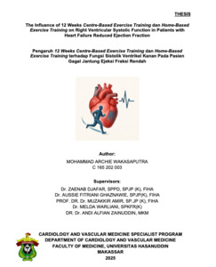 MOHAMMAD ARCHIE WAKASAPUTRA. Pengaruh 12 Weeks Centre-Based Exercise Training dan Home-Based Exercise Training terhadap Fungsi Sistolik Ventrikel Kanan Pada Pasien Gagal Jantung Ejeksi Fraksi Rendah (dibimbing oleh Zaenab Djafar, Aussie Fitriani Ghaznawie, Muzakkir Amir, Melda Warliani dan Andi Alfian Zainuddin) Latar belakang. Gagal jantung memiliki angka perkiraan kematian global sebanyak 17,31 juta atau 48% dari semua penyakit tidak menular, Selain terapi farmakologis, diharapkan penerapan rehabilitasi jantung dapat menurunkan mortalitas dan morbiditas yang ditimbulkan oleh gagal jantung, Tujuan. Mengetahui pengaruh perbaikan parameter ekokardiografi fungsi sistolik ventrikel kanan pada pasien gagal jantung fraksi ejeksi menurun di kelompok home-based exercise training terhadap kelompok Centre-based exercise training setelah menjalani program latihan selama 12 minggu, Metode. Penelitian ini merupakan penelitian quasi experimental terhadap 31 pasien dengan gagal jantung fraksi ejeksi rendah yang berobat di poliklinik Pusat Jantung Terpadu RS Wahidin Makassar yang dibagi kedalam dua kelompok perlakuan, yaitu home-based exercise dan Centre-based exercise yang dilaksanakan selama dua belas minggu untuk menilai perbaikan dari fungsi ventrikel kanan melalui pemeriksaan ekokardiografi berupa pengukuran TAPSE, S’ lateral dan rerata RV free wall longitudinal strain setelah diberikan intervensi exercise selama dua belas minggu. Hasil. Dari 31 sampel penelitian, Didapatkan adanya perbaikan signifikan dari fungsi sistolik ventrikel kanan berdasarkan pemeriksaan ekokardiografi, didapatkan perbaikan nilai signifikan TAPSE, S’ lateral dan rerata RV free wall longitudinal strain pada kedua kelompok perlakuan setelah menjalani exercise selama dua belas minggu pada pengukuran TAPSE dan S’lateral, serta p value 0.005 pada pengukuran rerata RV free wall longitudinal strain pada semua sampel, Selain itu, pada penelitian ini pula didapatkan perbaikan dari nilai TAPSE, S’ lateral dan rerata RV free wall longitudinal strain. Kesimpulan. Penelitian ini menunjukkan bahwa program home-based exercise selama dua belas minggu tidak lebih inferior dibandingkan dengan kelompok yang menjalani centre based exercise, dan juga pemberian intervensi exercise selama dua belas minggu terbukti dapat memperbaiki fungsi sistolik ventrikel kanan.