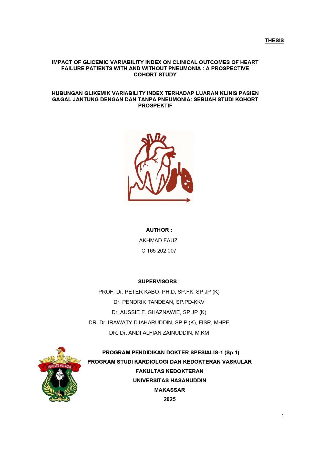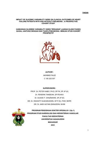 AKHMAD FAUZI. Hubungan Glikemik Variability Index Terhadap Luaran Klinis Pasien Gagal Jantung Dengn dan Tanpa Pneumonia: Sebuah Studi Kohort Prospektif (dibimbing oleh Peter Kabo, Pendrik Tandean, Aussie F. Ghaznawie, Irawaty Djaharuddin, Andi Alfian Zainuddin ). Latar Belakang: Gagal jantung merupakan masalah kesehatan utama di Asia dengan prevalensi yang lebih tinggi dibandingkan negara Barat. Pasien gagal jantung berisiko mengalami komplikasi infeksi seperti pneumonia yang berdampak pada perburukan luaran klinis. Variabilitas glikemik (GV) diketahui meningkatkan risiko mortalitas dan kejadian kardiovaskular, bahkan pada individu tanpa diabetes. Namun, data mengenai hubungan GV dengan luaran klinis pada pasien gagal jantung dengan dan tanpa pneumonia masih terbatas. Tujuan: Mengetahui hubungan antara indeks variabilitas glikemik (Glycemic Variability Index/GVI) terhadap luaran klinis pasien gagal jantung dengan dan tanpa pneumonia. Metode: Penelitian ini merupakan studi kohort prospektif yang dilakukan di Pusat Jantung Terpadu RSUP Dr. Wahidin Sudirohusodo, Makassar, pada bulan Oktober–Desember 2025. Subjek adalah pasien rawat inap dengan diagnosis gagal jantung yang diobservasi hingga 30 hari pasca rawat jalan. Data karakteristik, nilai GV, dan luaran klinis (lama perawatan, penggunaan ventilator, mortalitas, readmisi 30 hari, dan All-MACE) dianalisis dan dibandingkan antara kelompok pneumonia dan non-pneumonia. Hasil: Lama perawatan lebih panjang pada kelompok pneumonia (p = 0,003). Penggunaan ventilator dan mortalitas lebih tinggi pada kelompok pneumonia secara signifikan (p = 0,045 dan p = 0,044). GV, yang dinilai dari koefisien variasi (CoV), lebih tinggi pada pasien pneumonia meskipun tidak signifikan. CoV yang lebih tinggi berkorelasi signifikan dengan readmisi (p = 0,048), penggunaan ventilator (p = 0,056), mortalitas (p = 0,037), dan All-MACE (p = 0,008). Pasien dengan GV tinggi (CoV >21%) memiliki lama perawatan lebih panjang (p = 0,006) dan lebih banyak memerlukan ventilator (p = 0,012). Simpulan: Variabilitas glikemik yang tinggi berkaitan dengan luaran klinis yang lebih buruk pada pasien gagal jantung, terutama pada mereka yang juga mengalami pneumonia. Indeks GV dapat menjadi indikator prognostik penting dalam penatalaksanaan pasien gagal jantung. Kata kunci: Gagal jantung, pneumonia, variabilitas glikemik, glycemic variability index, koefisien variasi, luaran klinis.