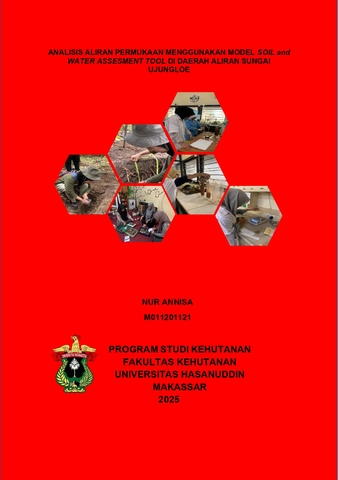 ABSTRAK NUR ANNISA. Analisis Aliran Permukaan Menggunakan Model Soil and Water Assesment Tool pada Daerah Aliran Sungai Ujungloe (dibimbing oleh Usman Arsyad) Latar Belakang. Pertumbuhan penduduk dan perubahan tata guna lahan yang tidak terkendali telah menyebabkan terganggunya keseimbangan hidrologis di Daerah Aliran Sungai Ujungloe, yang berdampak pada peningkatan aliran permukaan dan risiko banjir. Tujuan. Penelitian ini bertujuan untuk menganalisis aliran permukaan di Daerah Aliran Sungai Ujungloe menggunakan model Soil and Water Assessment Tool (SWAT) serta mengkaji pengaruh tutupan lahan terhadap besarnya aliran permukaan. DAS Ujungloe terletak di Kabupaten Bulukumba dan Sinjai, Sulawesi Selatan, dengan luas 20.473 ha. Metode. Analisis aliran permukaan dilakukan menggunakan model SWAT, yang secara otomatis menerapkan metode SCS-CN (Soil Conservation Service-Curve Number) untuk memperkirakan limpasan permukaan (Qsurf). Kemudian dihitung nilai kofisien C untuk mengatahui pengaruh tutupan lahan terhadap aliran permukaan. Hasil. Hasil penelitian menunjukkan bahwa total aliran permukaan tahunan sebesar 288,38 mm (14,71% dari curah hujan), dengan kontribusi tertinggi berasal dari tutupan lahan pertanian campur (265,21 mm) dan sawah (264,95 mm), sedangkan hutan primer menghasilkan aliran terendah (27,96 mm). Koefisien limpasan (C) sebesar 0,15 mengindikasikan kondisi hidrologi DAS yang baik. Kesimpulan. Simpulan penelitian ini menegaskan bahwa perubahan tutupan lahan, terutama peningkatan area pertanian dan permukiman, secara signifikan memengaruhi peningkatan aliran permukaan. Hasil ini dapat menjadi dasar rekomendasi pengelolaan DAS berkelanjutan untuk mitigasi banjir dan konservasi sumber daya air.