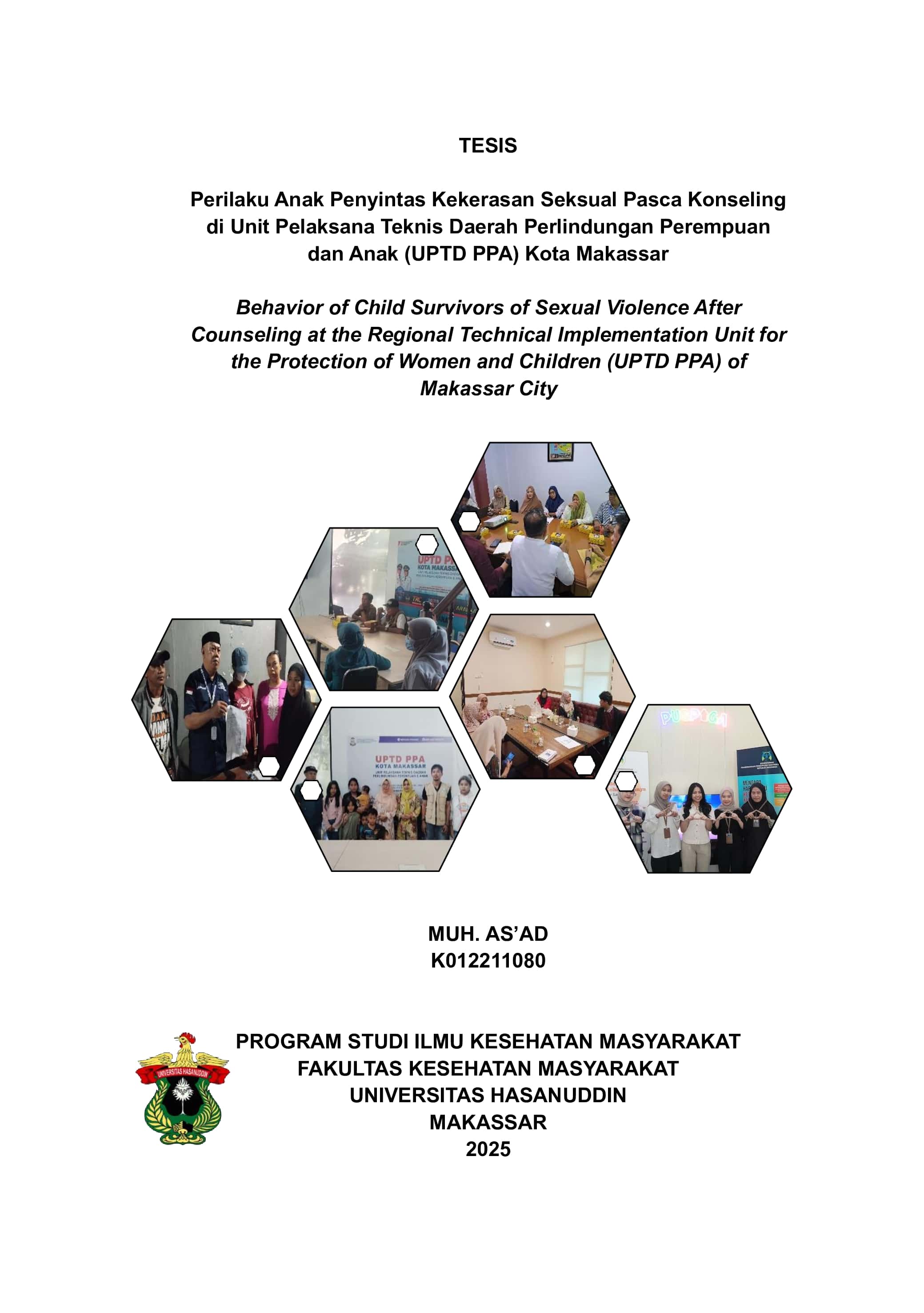 MUH. AS’AD. Perilaku anak penyintas kekerasan seksual pasca-konseling di Unit Pelaksana Teknis Daerah Perlindungan Perempuan dan Anak (UPTD PPA) Kota Makassar (dibimbing oleh Sudirman Nasir, dan Suriah). Latar Belakang. Penelitian tentang kekerasan seksual pada anak telah banyak dilakukan. Namun, penelitian ini tidak hanya mengeksplorasi kasus kekerasan seksual yang terjadi pada anak. Tetapi juga memetakan strategi coping yang digunakan penyintas pasca-konseling; pemberian layanan berbasis komunitas; dan dukungan sosial untuk penyintas dalam mengelola dampak trauma. Tujuan. Penelitian ini bertujuan mengungkap perilaku anak penyintas kekerasan seksual pasca konseling yang ditinjau dari strategi coping, efektivitas layanan perlindungan anak, serta dukungan sosial dalam penanganan kasus. Metode. Penelitian dilakukan menggunakan metode kualitatif dengan pendekatan studi kasus. Melibatkan informan utama (anak penyintas), informan kunci (pendamping UPTD PPA), dan informan tambahan (keluarga penyintas dan masyarakat). Hasil. Hasil menunjukkan bahwa anak penyintas menerapkan beberapa metode coping multidimensi, seperti pencarian dukungan, pengendalian diri, dan penerimaan. Layanan untuk penanganan kasus kekerasan seksual pada anak meliputi pengaduan, penjangkauan, pengelolaan kasus, pendampingan, rumah aman, dan layanan rujukan akhir. Serta layanan berbasis komunitas seperti Shelter warga, Forum Anak, dan PUSPAGA dalam membantu proses pemulihan penyintas. Dukungan sosial yang diberikan masyarakat melalui shelter warga dan para aktifis perlindungan anak memainkan peran penting dalam proses pemulihan. Kesimpulan. Penelitian ini merekomendasikan peningkatan integrasi layanan kesehatan dan sosial dengan pendekatan komunitas. Tujuannya untuk memperkuat sistem perlindungan dan pemulihan penyintas yang berkelanjutan.