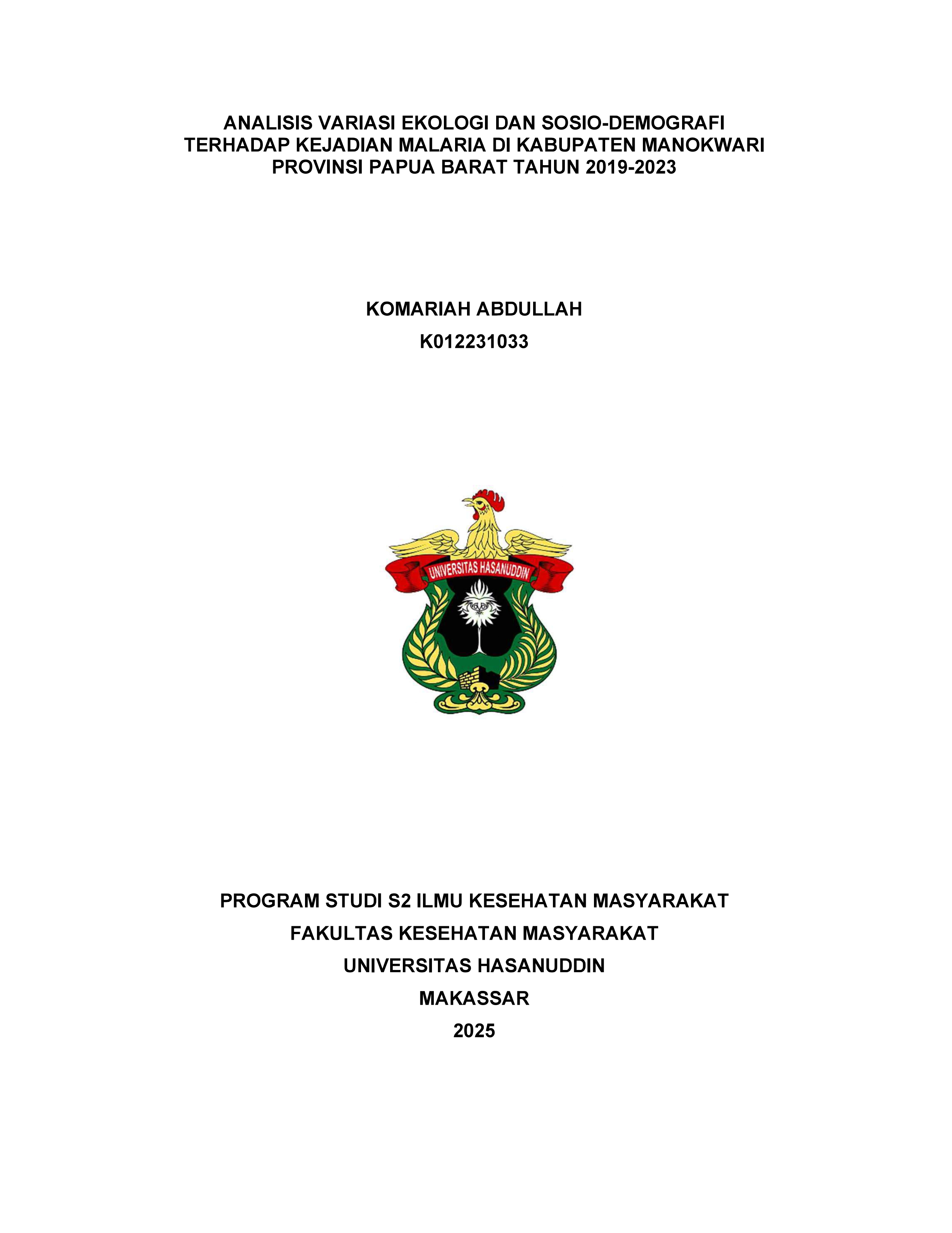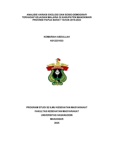 ABDULLAH, KOMARIAH (2025) Analisis Variasi Ekologi Dan Sosio-Demografi Terhadap Kejadian Malaria Di Kabupaten Manokwari Provinsi Papua Barat Tahun 2019-2023 = Analysis Of Ecological And Socio-Demographic Variations On The Incident Of Malaria In Manokwari District, Province Of West Papua In 2019-2023. Thesis thesis, Universitas Hasanuddin.
