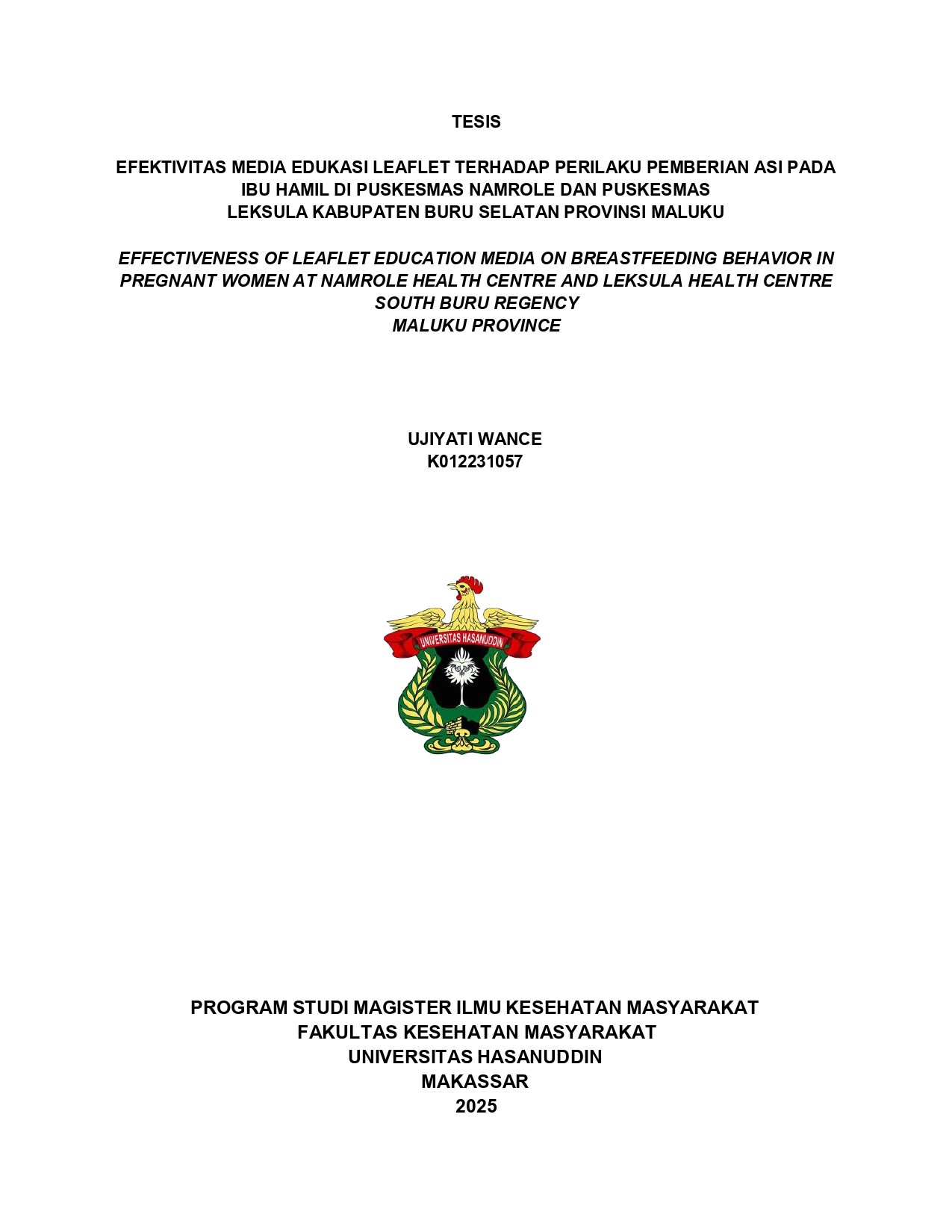 WANCE, UJIYATI (2025) Efektivitas Media Edukasi Leaflet Terhadap Perilaku Pemberian ASI Pada Ibu Hamil Di Puskesmas Namrole Dan Puskesmas Leksula Kabupaten Buru Selatan Provinsi Maluku = Effectiveness Of Leaflet Education Media On Breastfeeding Behavior Among Pregnant Women At Namrole And Leksula Health Centers In South Buru District, Maluku Province. Thesis thesis, Universitas Hasanuddin.
