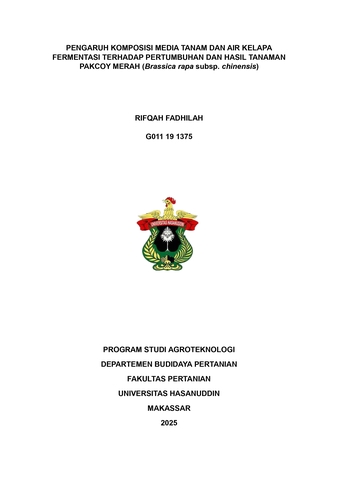 FADHILAH, RIFQAH (2025) Pengaruh Komposisi Media Tanam dan Air Kelapa Fermentasi Terhadap Pertumbuhan dan Hasil Tanaman Pakcoy Merah (Brassica rapa subsp. chinensis) = Effect of Planting Media Composition and Fermented Coconut Water on Growth and Yield of Red Pakchoy (Brassica rapa subsp. chinensis). Skripsi thesis, Universitas Hasanuddin.