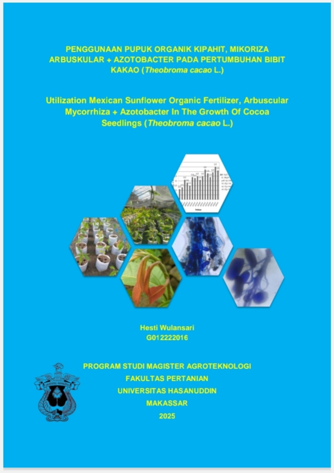 Hesti Wulansari. Penggunaan Pupuk Organik Kipahit, Mikoriza Arbuskular + Azotobacter Pada Pertumbuhan Bibit Kakao (Theobroma cacao L.) (dibimbing oleh Rafiuddin dan Muh. Jayadi) Latar Belakang. Produksi kakao (Theobroma cacao L.) menghadapi tantangan besar, termasuk kebutuhan untuk meningkatkan hasil produksi secara berkelanjutan dan mengurangi ketergantungan pada pupuk kimia. Tujuan. Penelitian ini bertujuan untuk mengevaluasi efektivitas pupuk organik kipahit, mikoriza arbuskular dan azotobacter dalam meningkatkan pertumbuhan dan produksi bibit kakao. Metode. Penelitian menggunakan Rancangan Acak Kelompok (RAK) pola faktorial dua faktor. Faktor pertama adalah dosis pupuk organik kipahit terdiri atas empat taraf yaitu: 0 g, 80 g, 160 g, dan 240 g, sedangkan faktor kedua adalah kombinasi Mikoriza Arbuskular + Azotobacter terdiri atas empat taraf yaitu: 0 g; 10 g mikoriza + 3 mL azotobacter; 15 g mikoriza + 6 mL azotobacter; dan 20 g mikoriza + 9 mL azotobacter. Terdiri atas 3 unit tanaman dan diulang sebanyak 3 kali. Hasil. Penelitian menunjukkan bahwa terdapat interaksi antara dosis pupuk organik kipahit 240 g dengan komposisi mikoriza arbuskular 20 g + azotobacter 9 mL menghasilkan nilai tertinggi pada bobot basah akar (30,00 g), panjang akar (79,10 cm) dan volume akar (33,40 cm3), sedangkan dosis pupuk organik kipahit 240 g memberikan hasil tertinggi pada tinggi tanaman (58,94 cm), diameter pangkal batang (13,61 mm), bobot basah tajuk (70,33 g) dan bobot kering tajuk (21,21 g) dan komposisi mikoriza arbuskular 15 g + azotobacter 6 mL memberikan hasil tertinggi pada jumlah cabang (4,58 cabang) dan kerapatan stomata (115,07 mm-2). Kandungan nitrogen dan fosfor dalam daun : 1,23 % untuk N dan 0,35 % untuk P serta akar tanaman terinfeksi 100%. Kesimpulan. Pupuk organik kipahit dengan mikoriza arbuskular + azotobacter efektif dan menunjukkan pengaruh positif signifikan pada pertumbuhan dan fisiologi bibit kakao.