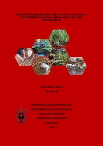 ABSTRAK YUNI AMELIA SIRAIT. Respon Pertumbuhan Bibit Tanaman Tebu (Saccharum officinarum L.) pada Pemberian Biochar Limbah Ampas Tebu dan Trichokompos (dibimbing oleh Nuniek Widiayani dan Kaimuddin) Latar belakang. Budidaya tebu (Saccharum officinarum L.) merupakan sektor penting bagi industri dan pertanian. Namun, praktik pertanian yang tidak berkelanjutan sering kali menurunkan produktivitas tebu. Penggunaan bahan organik seperti trichokompos dan biochar limbah ampas tebu dapat memperbaiki kualitas tanah dan meningkatkan pertumbuhan tanaman. Tujuan. Penelitian ini bertujuan untuk mengetahui dan menganalisis pengaruh pemberian biochar limbah ampas tebu dan trichokompos terhadap pertumbuhan bibit tanaman tebu. Metode. Penelitian ini dilaksanakan di Kebun Percobaan, Fakultas Pertanian, Universitas Hasanuddin, Kecamatan Tamalanrea, Kota Makassar, Provinsi Sulawesi Selatan. Penelitian ini berlangsung pada bulan September 2024 - Januari 2025. Penelitian ini dilakukan menggunakan Rancangan Faktorial 2 Faktor (F2F) berdasarkan Rancangan Acak Kelompok (RAK) sebagai rancangan lingkungan. Faktor pertama adalah pemberian dosis dengan 3 taraf yaitu tanpa biochar (kontrol), 30 g/polybag biochar, dan 60 g/polybag biochar. Faktor kedua adalah dosis trichokompos dengan 4 taraf yaitu tanpa trichokompos (kontrol), 40 g/polybag trichokompos, 70 g/polybag trichokompos, dan 100 g/polybag trichokompos. Hasil. Hasil penelitian menunjukkan bahwa interaksi 60 g/polybag biochar ampas tebu dan 100 g/polybag trichokompos menghasilkan pertumbuhan bibit tebu terbaik dengn rata-rata tertinggi pada diameter batang (26,73 mm). Dosis biochar 30 g/polybag menghasilkan berat basah tajuk dengan rata-rata tertinggi (25,99 g). Dosis 100 g/polybag trichokompos memberikan pertumbuhan jumlah daun dengan rata-rata tertinggi (10,78 helai). Kesimpulan. Pemberian biochar ampas tebu dan trichokompos secara bersama-sama dapat meningkatkan pertumbuhan bibit tebu secara signifikan. Dosis optimal yang direkomendasikan adalah 30 g/polybag biochar, 60 g/polybag biochar, dan 100 g/polybag trichokompos memberikan pengaruh signifikan pada bibit tebu.