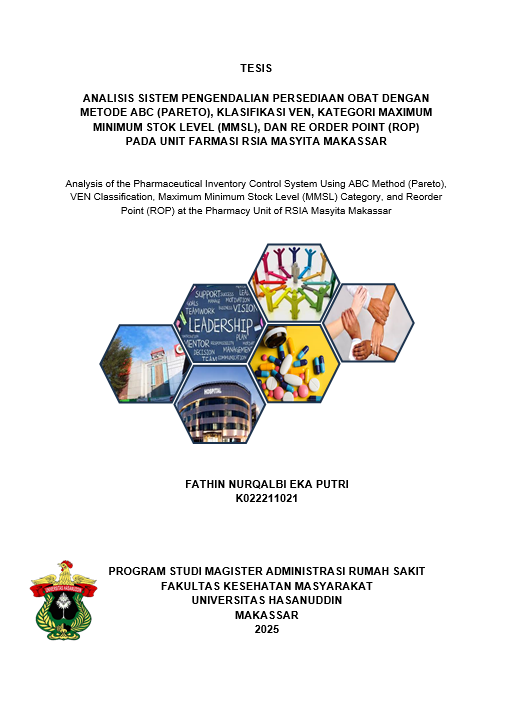 ANALISIS SISTEM PENGENDALIAN PERSEDIAAN OBAT DENGAN METODE ABC (PARETO), KLASIFIKASI VEN, KATEGORI MAXIMUM MINIMUM STOK LEVEL (MMSL), DAN RE ORDER POINT (ROP) PADA UNIT FARMASI RSIA MASYITA MAKASSAR = ANALYSIS OF THE PHARMACEUTICAL INVENTORY CONTROL SYSTEM USING ABC METHOD (PARETO), VEN CLASSIFICATION, MAXIMUM MINIMUM STOCK LEVEL (MMSL) CATEGORY, AND REORDER POINT (ROP) AT THE PHARMACY UNIT OF RSIA MASYITA MAKASSAR