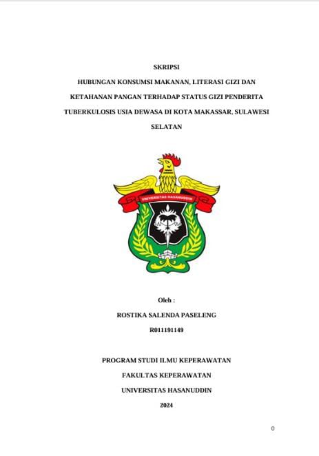 PASELENG, ROSTIKA SALENDA (2025) HUBUNGAN KONSUMSI MAKANAN, LITERASI GIZI DAN KETAHANAN PANGAN TERHADAP STATUS GIZI PENDERITA TUBERKULOSIS USIA DEWASA DI KOTA MAKASSAR, SULAWESI SELATAN = THE CORRELATION BETWEEN FOOD CONSUMPTION, NUTRITIONAL LITERACY, AND FOOD SECURITY ON NUTRITION STATUS OF ADULT TUBERCULOSIS PATIENTS IN MAKASSAR CITY, SOUTH SULAWESI. Skripsi thesis, Universitas Hasanuddin.