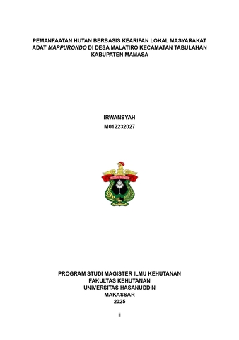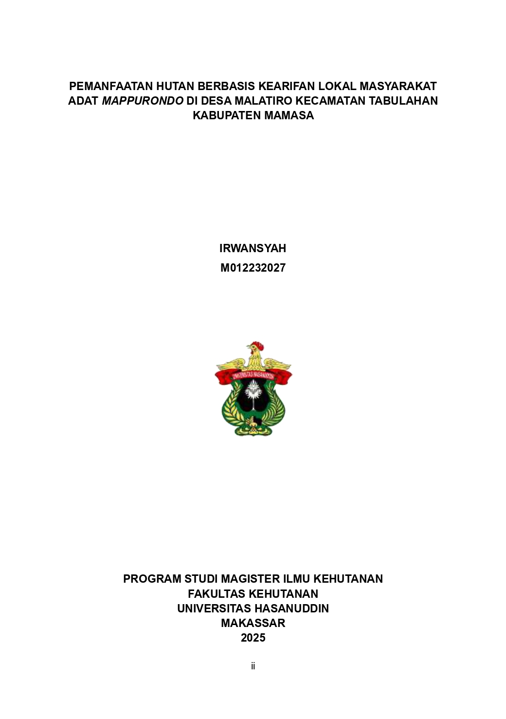 PEMANFAATAN HUTAN BERBASIS KEARIFAN LOKAL MASYARAKAT ADAT MAPPURONDO DI DESA MALATIRO KECAMATAN TABULAHAN KABUPATEN MAMASA = FOREST UTILIZATION BASED ON LOCAL WISDOM OF THE MAPPURONDO INDIGENOUS COMMUNITY IN MALATIRO VILLAGE, TABULAHAN DISTRICT, MAMASA REGENCY