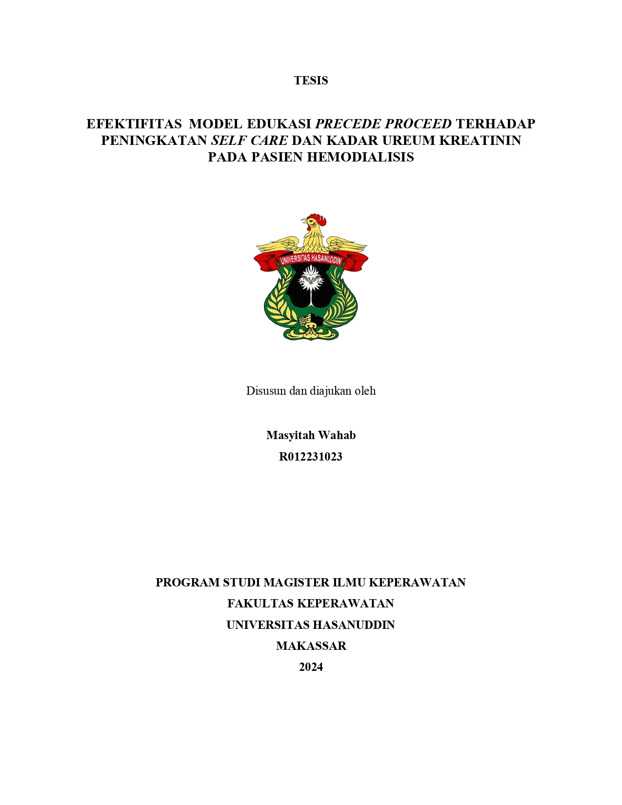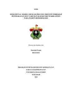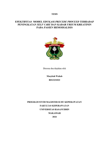WAHAB, MASYITAH (2025) Efektifitas Model Edukasi PRECEDE PROCEED Terhadap Peningkatan Self Care dan Kadar Ureum Kreatinin Pada Pasien Hemodialisis = The Effectiveness of PRECEDE PROCEED Educational Model on Improving Self Care and Ureum Creatinine Levels in Hemodialysis Patients. Thesis thesis, Universitas Hasanuddin.