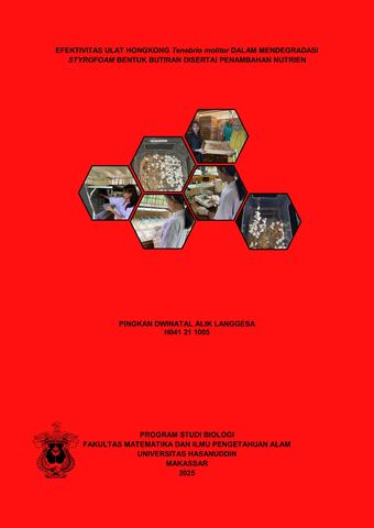 PINGKAN DWINATAL ALIK LANGGESA, 2025. Efektivitas ulat hongkong Tenebrio molitor dalam mendegradasi Styrofoam bentuk butiran disertai penambahan nutrien (dibimbing oleh Prof. Dr. Dirayah Rauf Husain, DEA). Latar belakang. Indonesia menghasilkan 69,9 juta ton sampah, dengan 33,72% belum tertangani optimal. Sampah plastik—khususnya Styrofoam—menjadi ancaman serius karena sulit terurai, berbahaya bagi lingkungan dan kesehatan manusia, serta banyak digunakan sebagai kemasan makanan dan elektronik. Penggunaan sekali pakainya menyebabkan penumpukan limbah, sementara pembakaran yang tidak tepat menghasilkan gas beracun. Untuk itu, penelitian ini menguji bioremediasi ramah lingkungan menggunakan Ulat Hongkong Tenebrio molitor. Tujuan. Menganalisis efektivitas ulat dalam mendegradasi Styrofoam dan pengaruh campuran pakan nutrien pada proses degradasi. Metode. Pengambilan sampel, adaptasi, perlakuan, dan pengolahan data. Kesimpulan. Ulat efektif mendegradasi Styrofoam pada umur 40–68 hari (menjelang fase pupa), tetapi campuran pakan tambahan tidak berpengaruh signifikan karena ulat lebih memilih mengonsumsi pakan bergizi daripada Styrofoam.