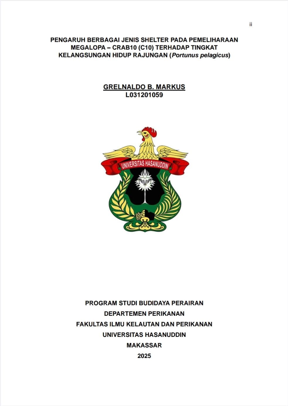 ABSTRAK GRELNALDO B. MARKUS, Pengaruh Berbagai Jenis Shelter pada Pemeliharaan Megalopa - Crablet 10 (C10) terhadap Tingkat Kelangsungan Hidup Rajungan (Portunus pelagicus) dibimbing oleh Yushinta Fujaya. Latar Belakang. Rajungan (Portunus pelagicus) merupakan primadona komoditas perikanan dengan nilai ekonomi yang tinggi. Permintaan rajungan bersifat exponensial (meningkat secara cepat seiring waktu), bertolak belakang dengan ketersediaan rajungan yang justru menurun dari waktu ke waktu. Budidaya menjadi ujung tombak dalam memenuhi permintaan pasar rajungan. Hanya saja, dalam pelaksaaan mengalami kendala yaitu suplai benih yang minim diakibatkan tingginya tingkat mortalitas pada benih rajungan. Tujuan. Penelitian ini bertujuan mengetahui jenis shelter yang tepat, guna meningkatkan tingkat kelangsungan hidup benih rajungan. Metode. Penelitian ini berlangsung pada bulan September 2024 di Hatchery Rajungan Balai Perikanan Budidaya Air Payau (BPBAP) Takalar. Hewan uji yang digunakan adalah benih rajungan stadia megalopa dengan padat tebar 1 ind/L. Wadah yang digunakan adalah bak fiber dengan kapasitas 400 L. Penelitian ini memiliki tiga perlakuan yaitu shelter net 4 mm, shelter net 6 mm, dan shelter tali sebagai kontrol dalam penelitian ini. Masing-masing percobaan penelitian ini memiliki tiga kali ulangan. Hasil. Hasil penelitian menunjukkan shelter net 4 mm memiliki tingkat kelangsungan hidup tertinggi yaitu 30,44%, disusul shelter net 6 mm (27.11%), dan shelter tali memiliki tingkat kelangsungan hidup terendah (15,55%) (p<0,01). Kesimpulan. Disimpulkan bahwa jenis shelter sangat berpengaruh terhadap Tingkat kelangsungan hidup benih rajungan. Kata kunci : rajungan; pembenihan; Tingkat kelangsungan hidup; shelter.